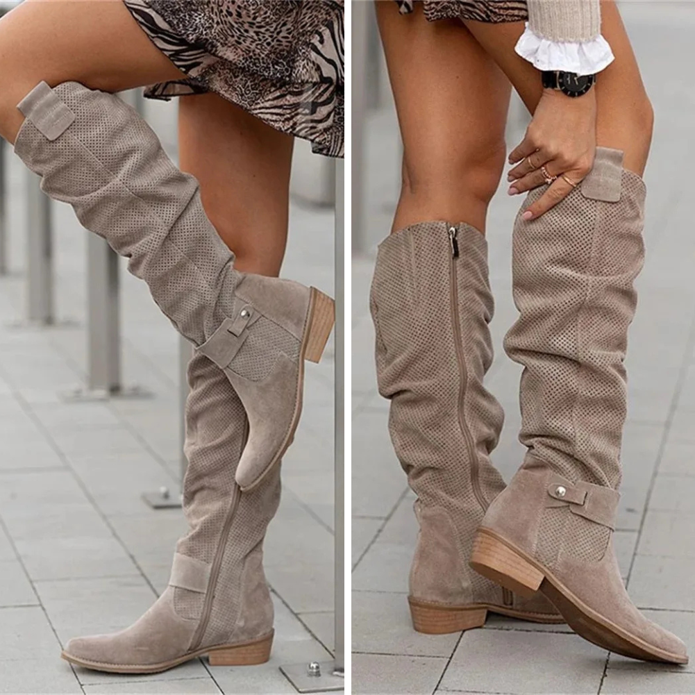 These knee-high boots effortlessly combine elegance and everyday wearability. The modern design, featuring a fine texture and refined details, makes them a real eye-catcher, while the comfortable block heel ensures maximum comfort – even when worn all day long. Whether paired with a dress, a skirt, or your favorite jeans, these boots instantly add a stylish touch to any outfit. They are versatile, timeless, and the perfect choice for transitional weather or cool days.