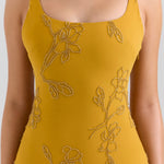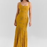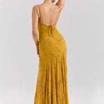 Aurelia glimmers with floral embellishments that catch the light from every angle. It features a soft scoop neckline, slender adjustable straps, and a lace-up back that cinches the waist.