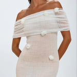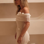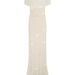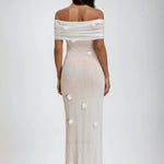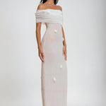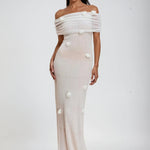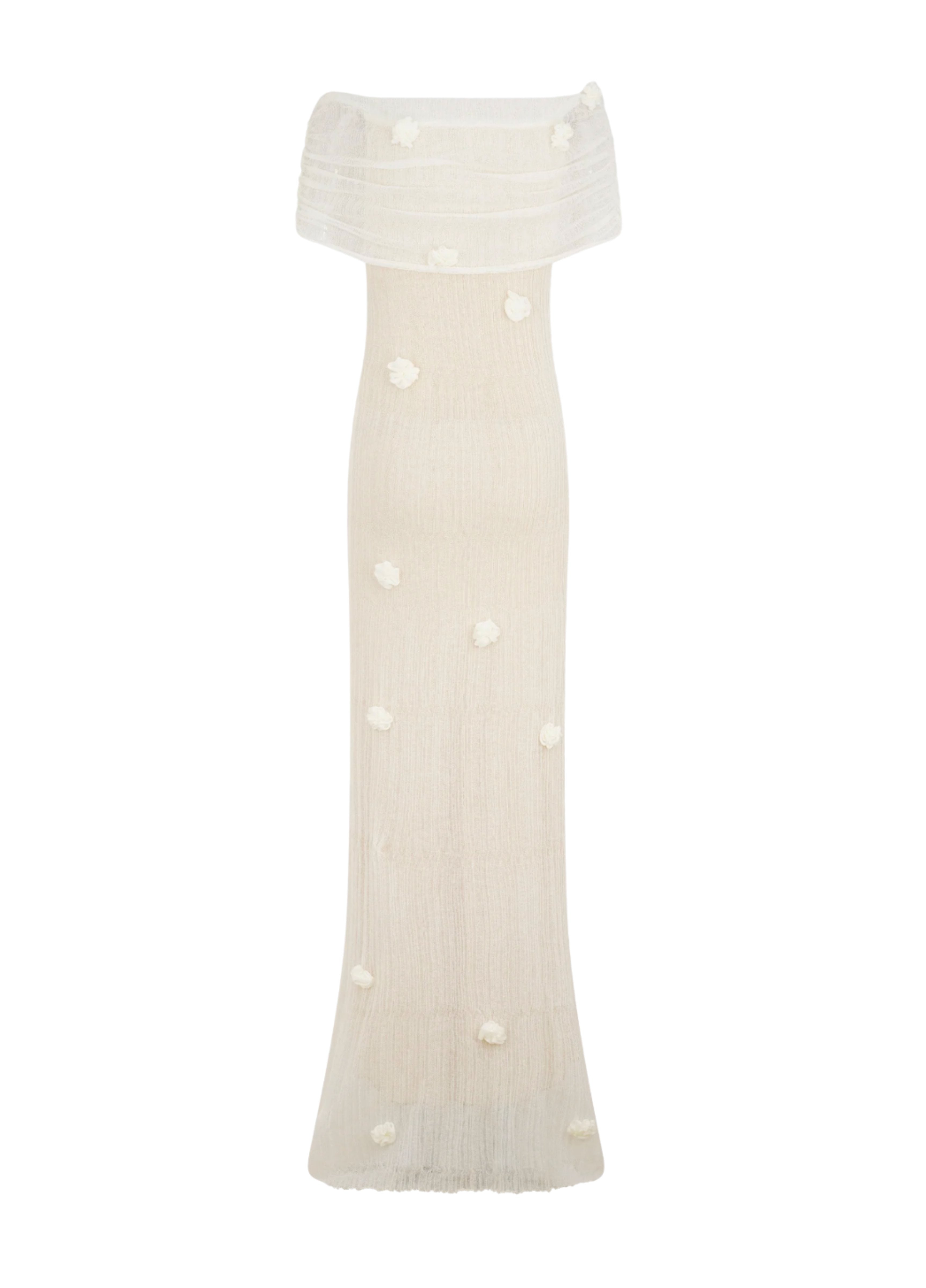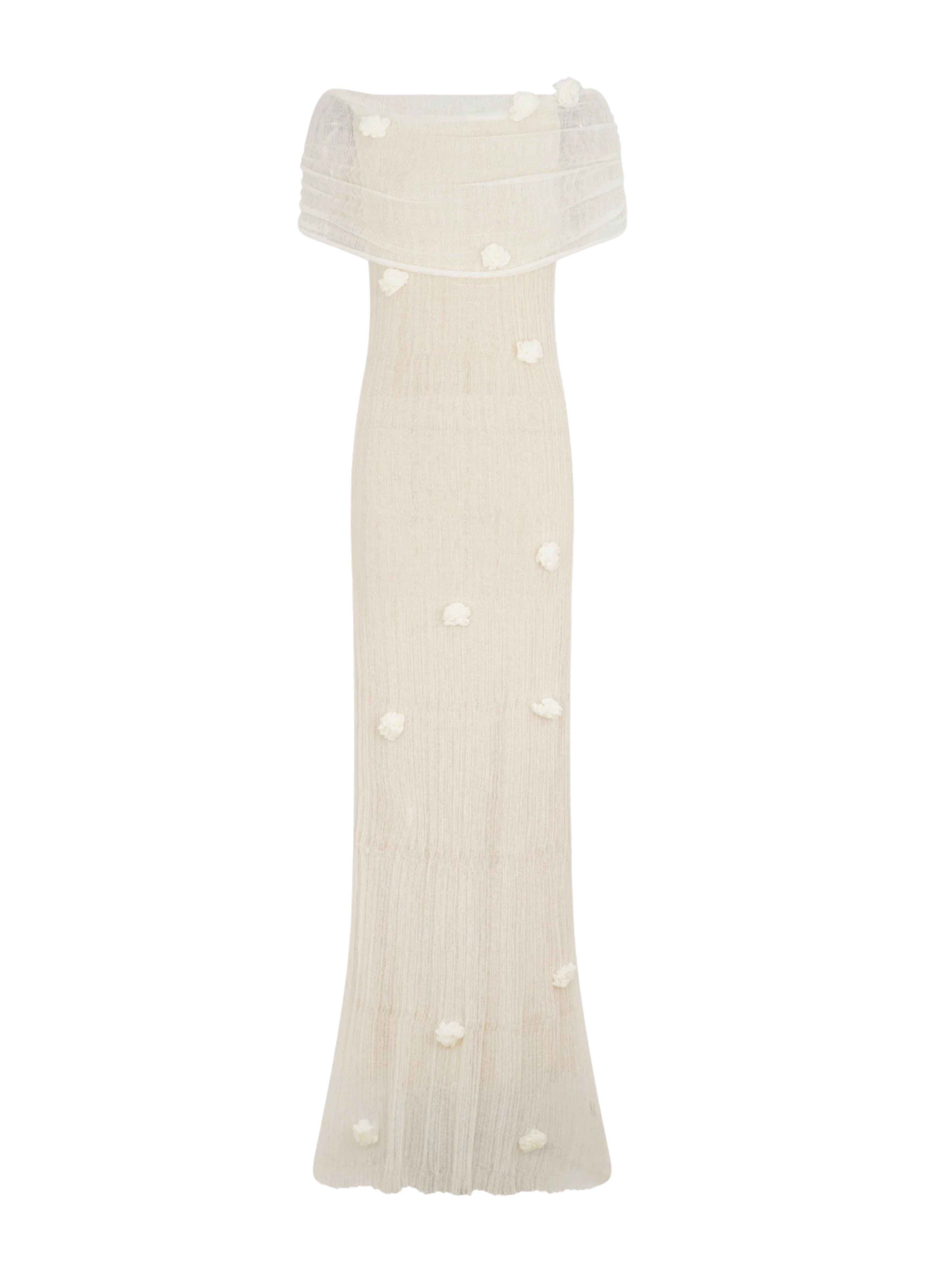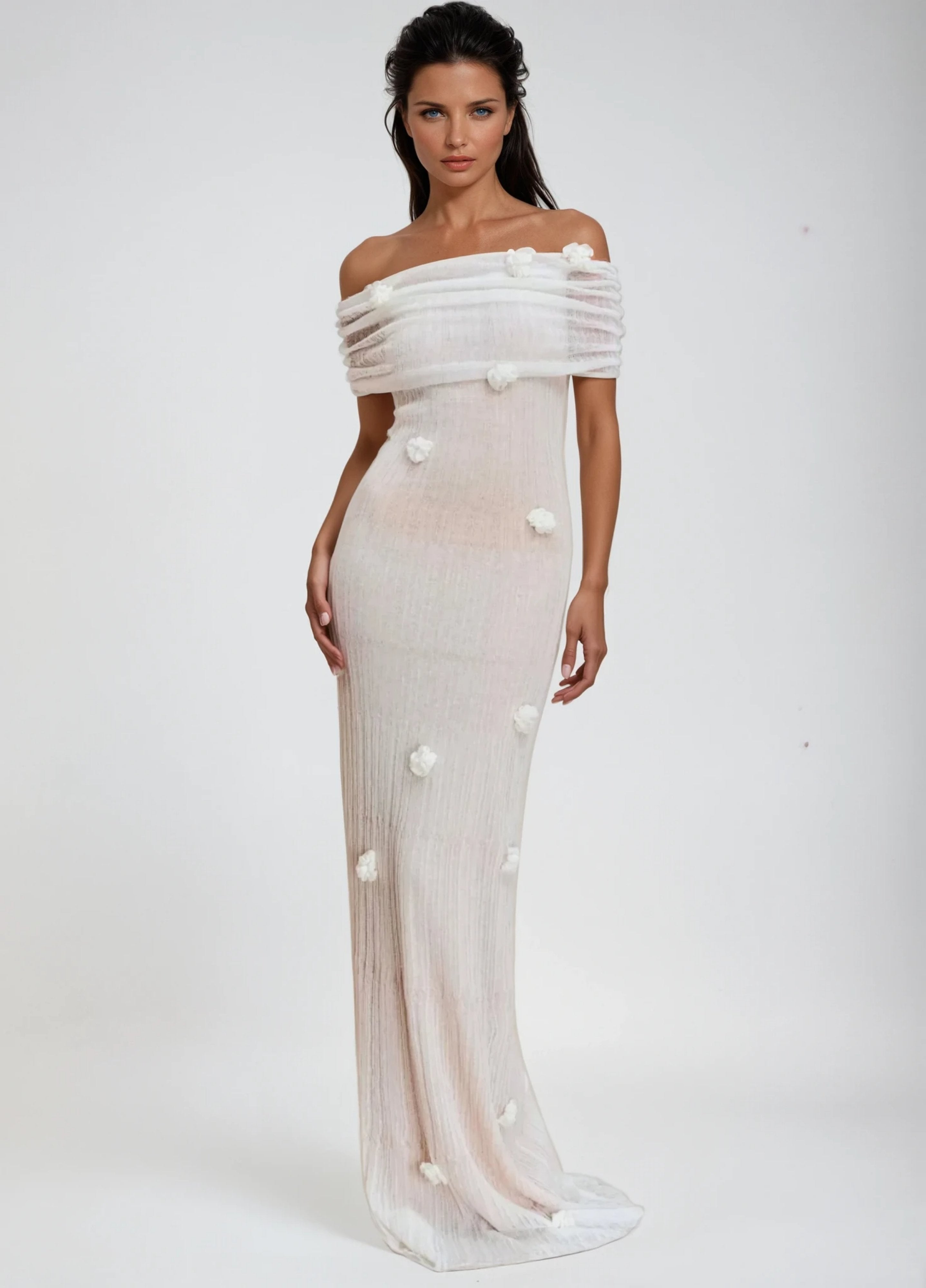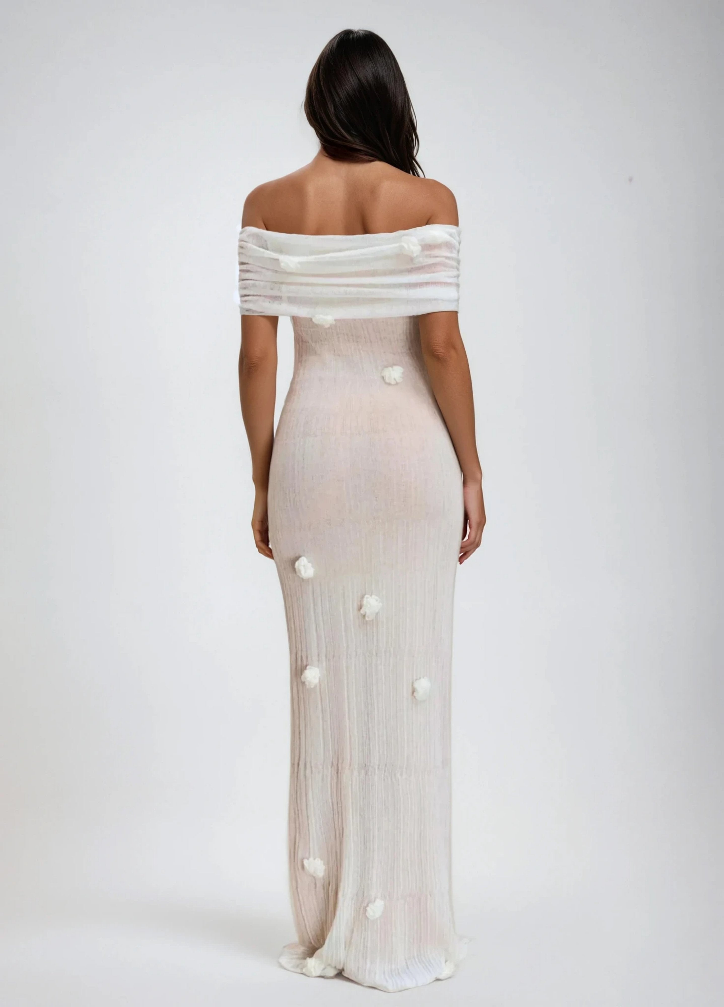 Celestine enchants with its off-the-shoulder neckline and delicately ruched overlay. Crafted in sheer knit and lined with soft mesh for comfort and coverage, its maxi skirt moves effortlessly while floral embellishments add a whimsical touch.