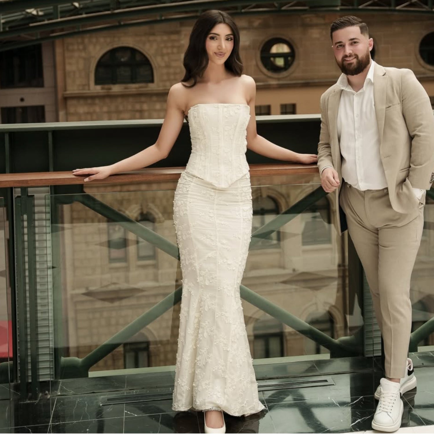 Designed to flatter every curve, Evelisse pairs a structured corset with a sweeping lace skirt — made for evenings that linger in memory.