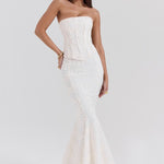 Evelisse captivates with a corseted bodice and floor-sweeping skirt, crafted from delicate embroidered detailing. The strapless neckline and lace-up back frame the silhouette, while the matching skirt glides over the body before flaring into godet panels.