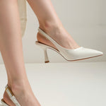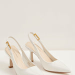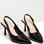 The 'Elizabeth Low Sling Back Court Heels' is your wardrobe's new best friend - sleek patent leather slingbacks with that perfect glossy shine that catches the light (and compliments) wherever you go. These razor-sharp pointed toe beauties feature a chic slingback strap that hugs your heel just right, making them the ultimate "I've got this" shoe for any occasion.