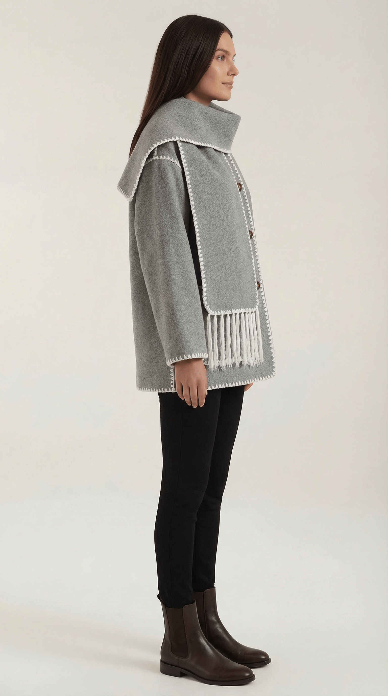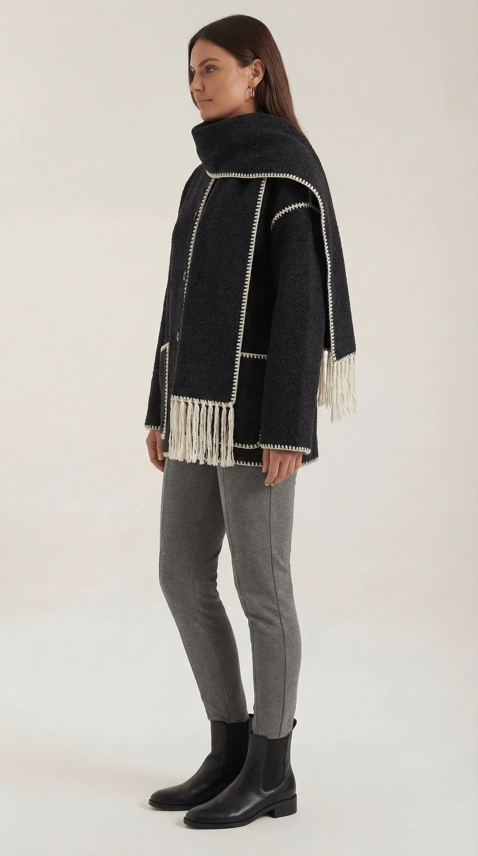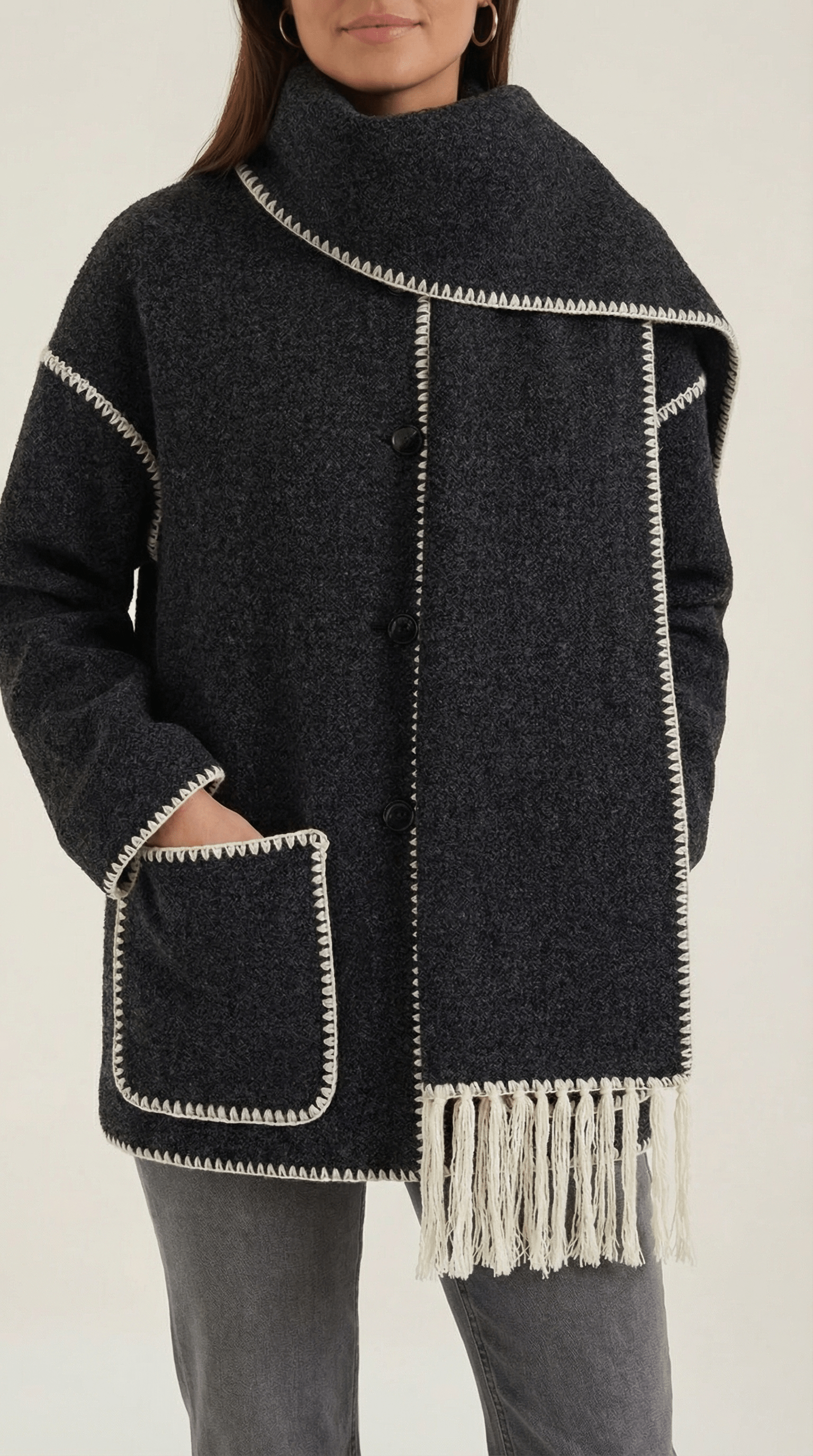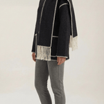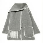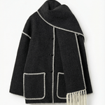 Wrap yourself in cosy, runway-ready vibes with this all-in-one 'Catherine Contrast Trim Scarf Jacket' that keeps you warm while making every sidewalk your catwalk! Trendy contrast trims and a unique wrap design instantly upgrade even your simplest outfits — comfort and style just became BFFs!
