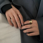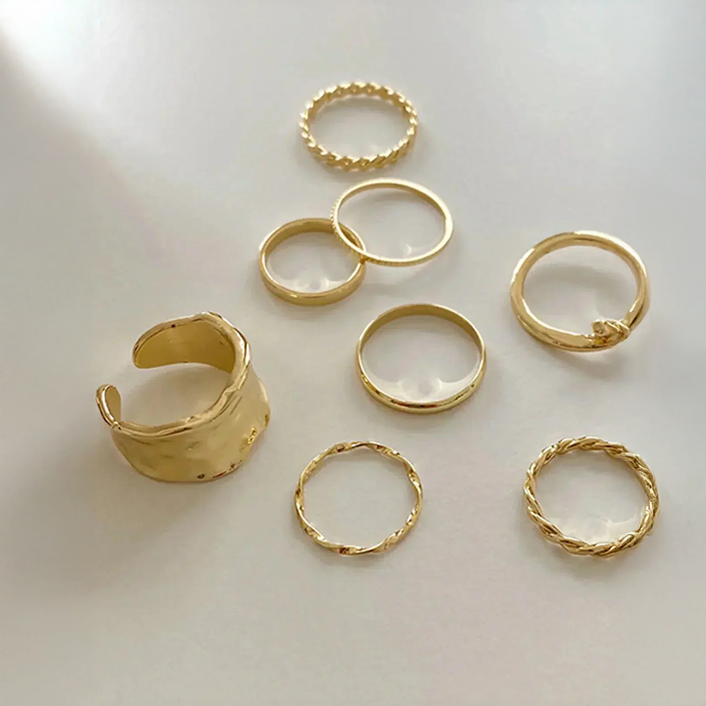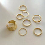 The LORIENNA Ring Set consists of eight elegant pieces designed to combine lightness and durability for everyday wear. Perfect for stacking or wearing individually, these versatile rings add a minimalist and chic touch to any of your outfits.
