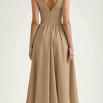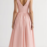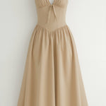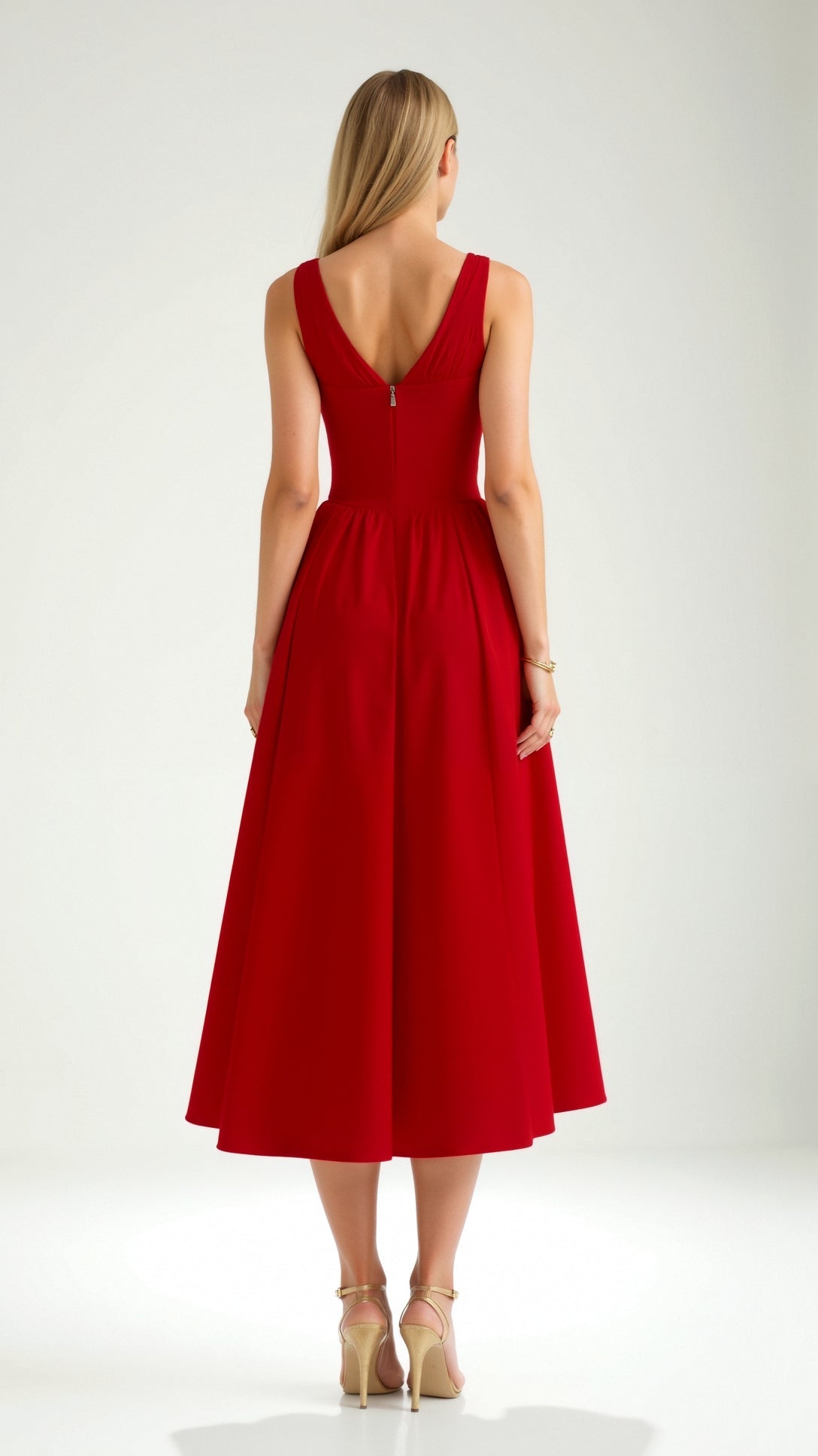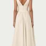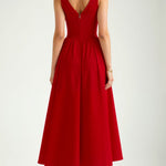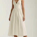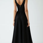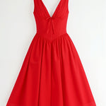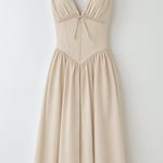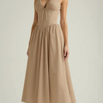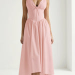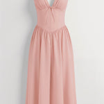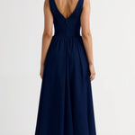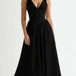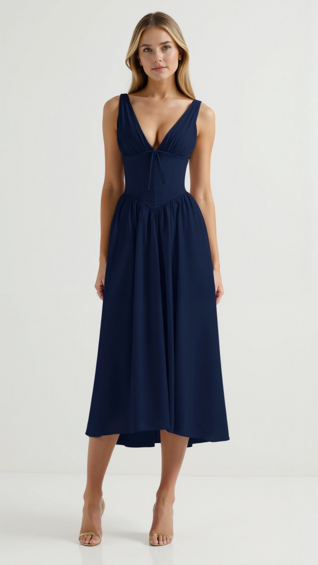 The 'Cassiopeia Midi Plunge Dress' is timeless elegance redefined - that sophisticated piece that makes you look effortlessly chic whether you're at a summer wedding or enjoying an evening dinner party. This stunning stunner features a dramatic plunging V-neckline with elegant twisted front detail and wide supportive straps, cinching at the waist before flowing into a full gathered midi skirt.