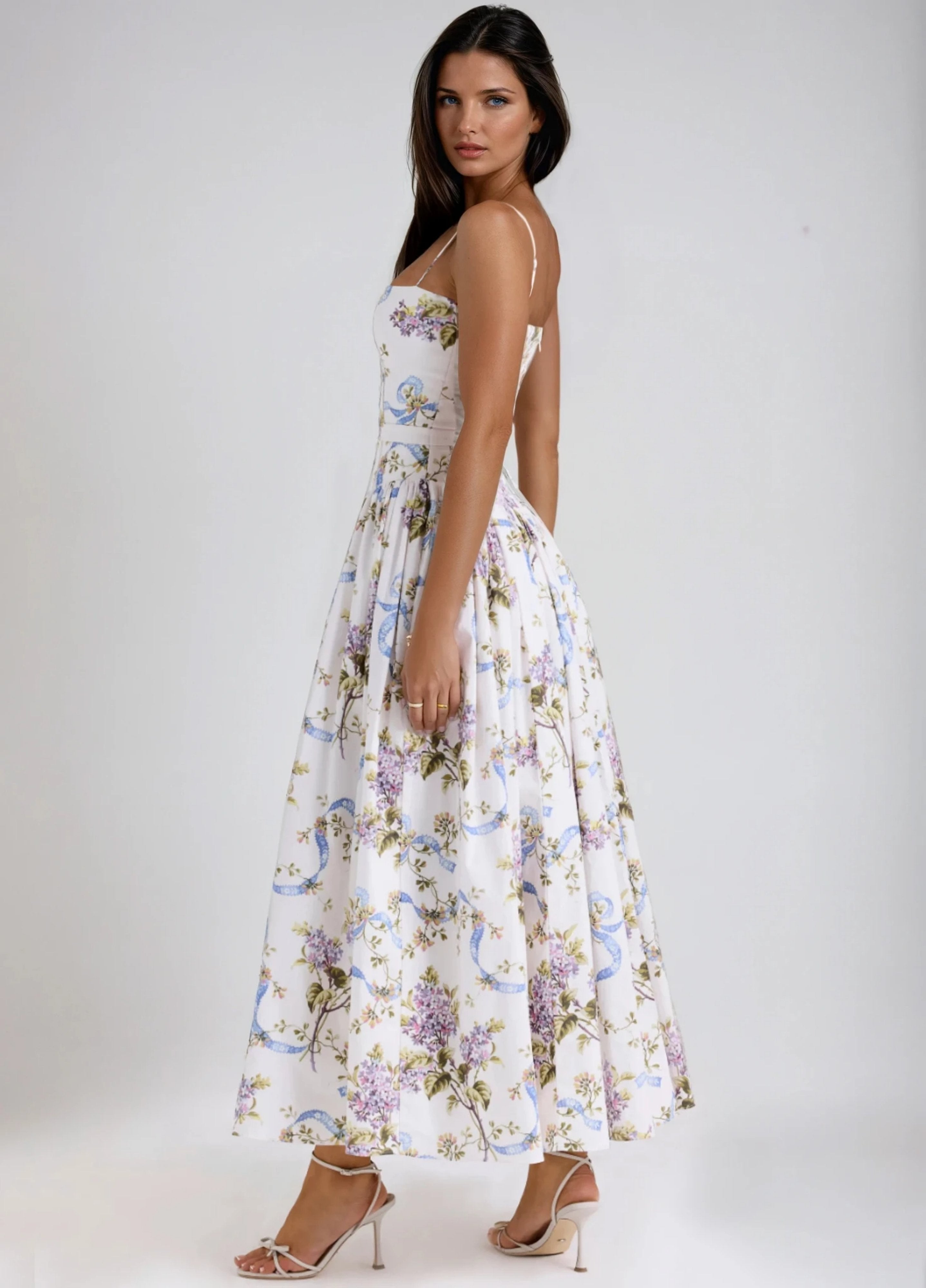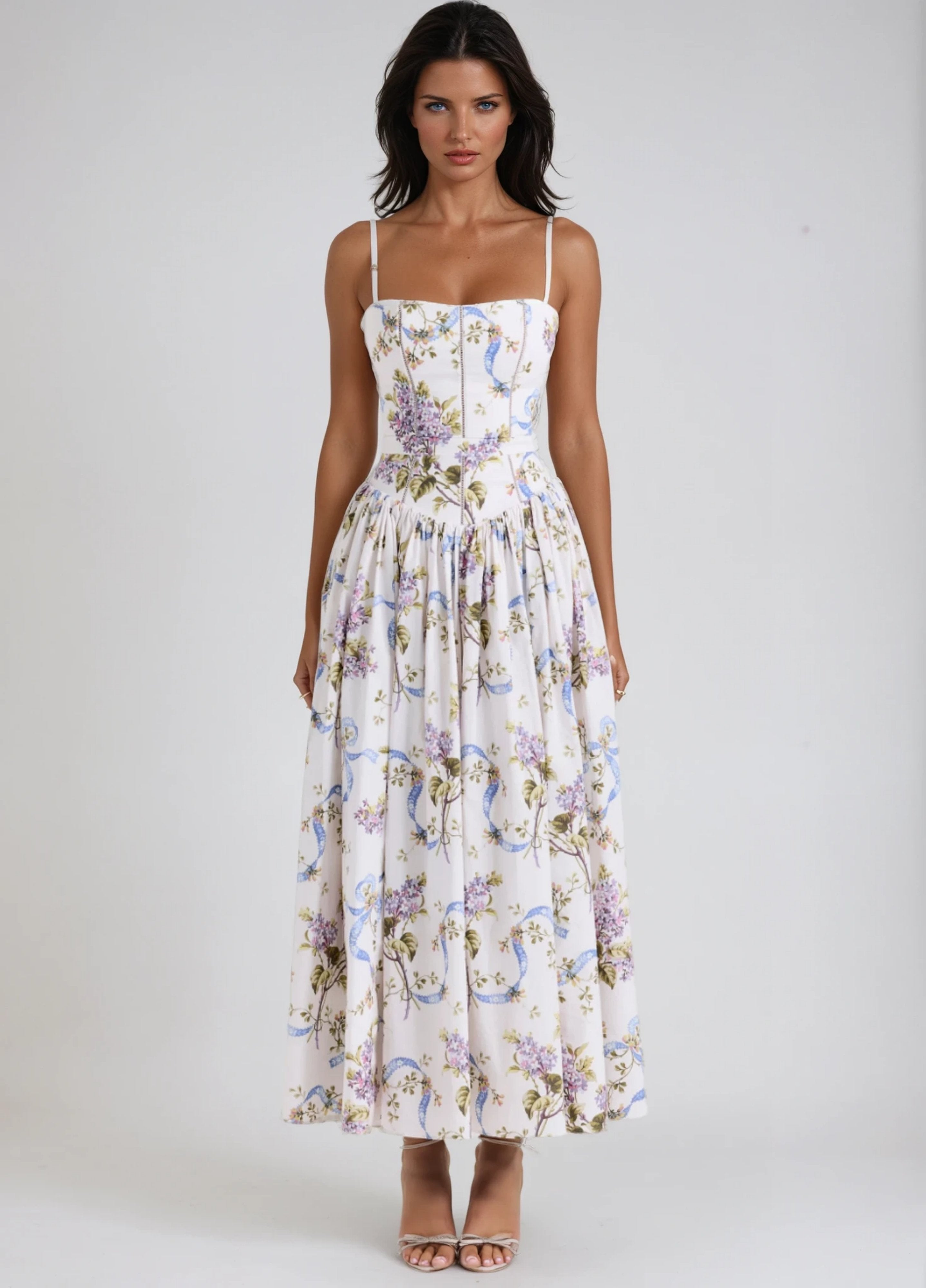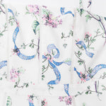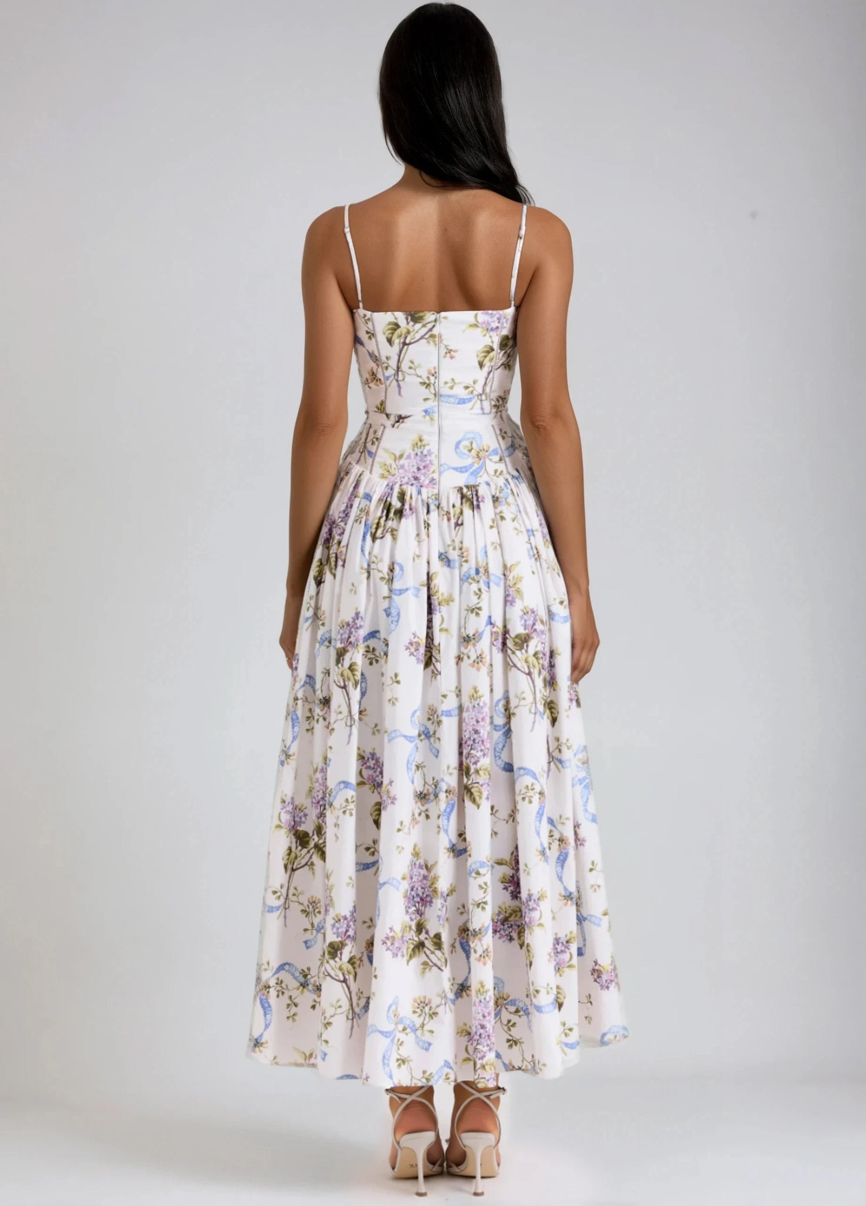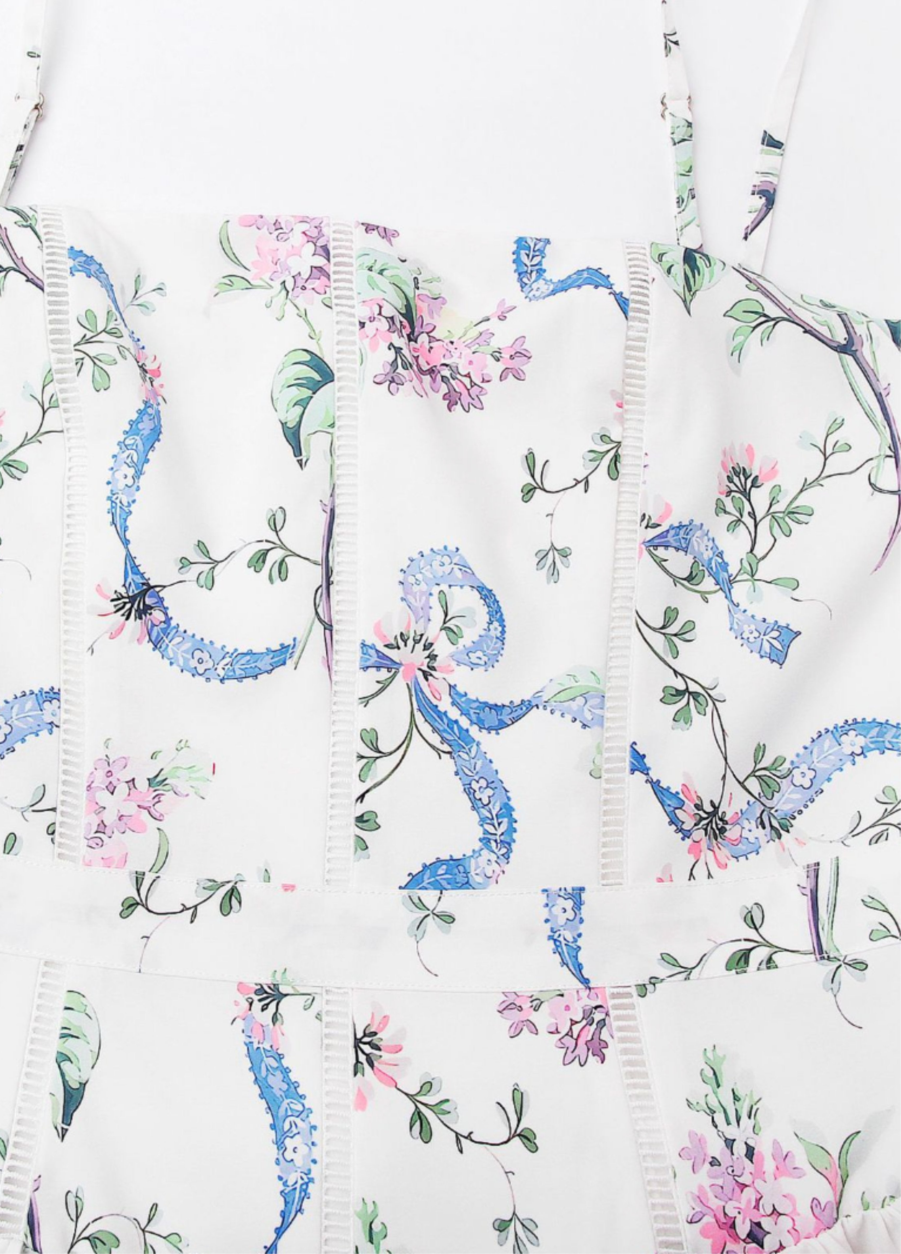 Seraphina is crafted in an off-white floral and ribbon print. The sculpted bodice, delicate ladder trims, and contoured panelling create a flattering, cinched-in shape with adjustable straps.