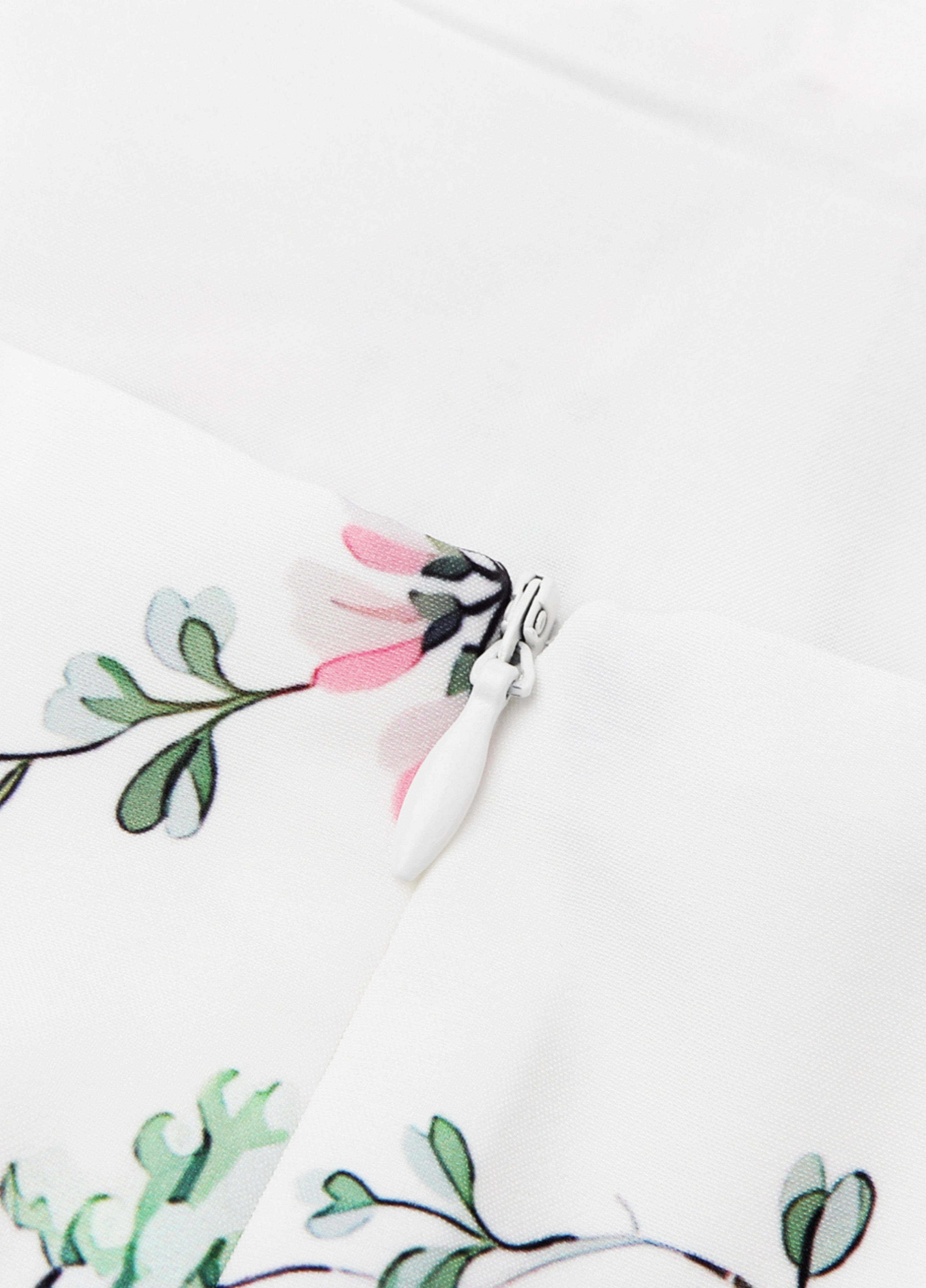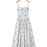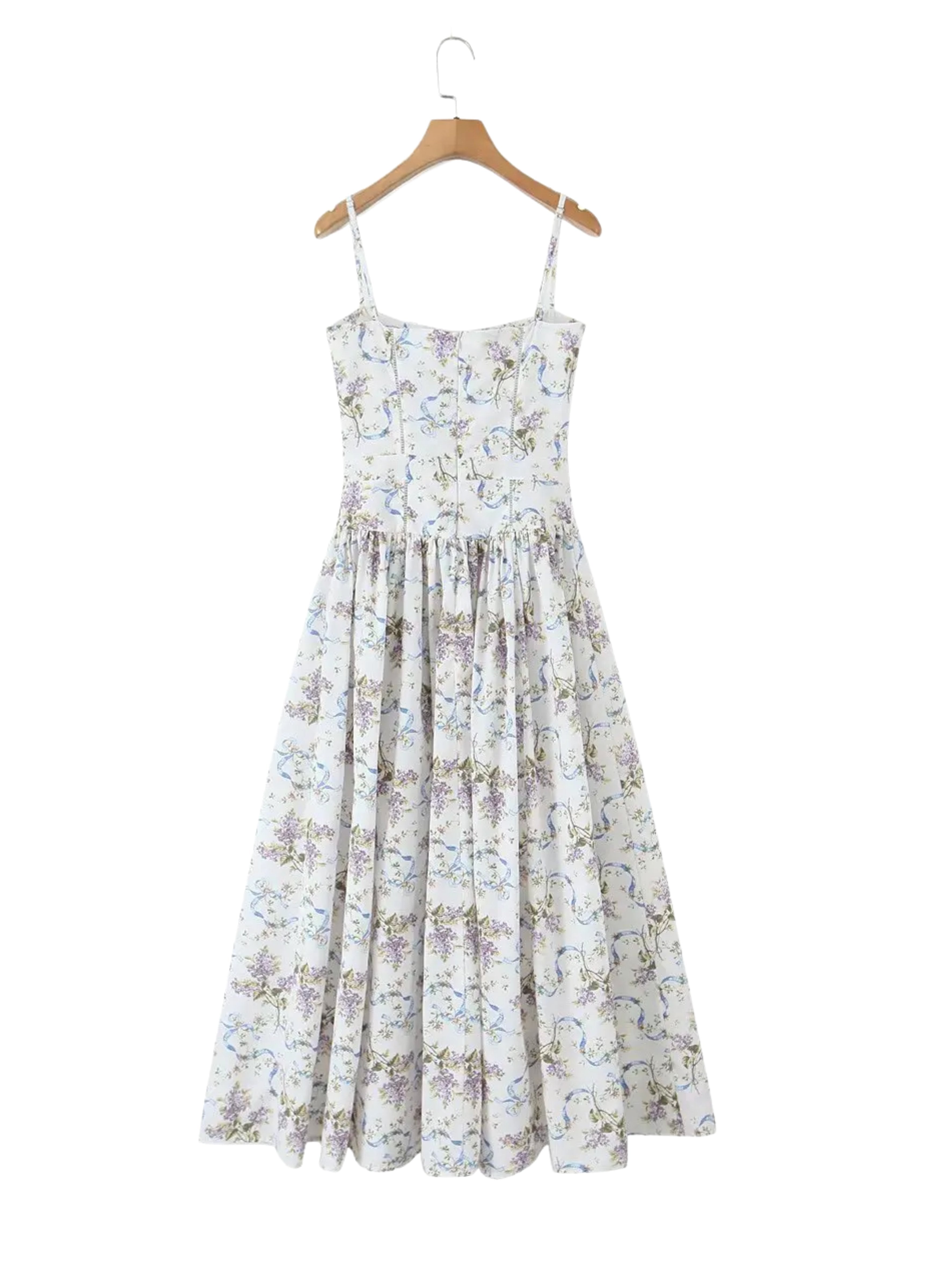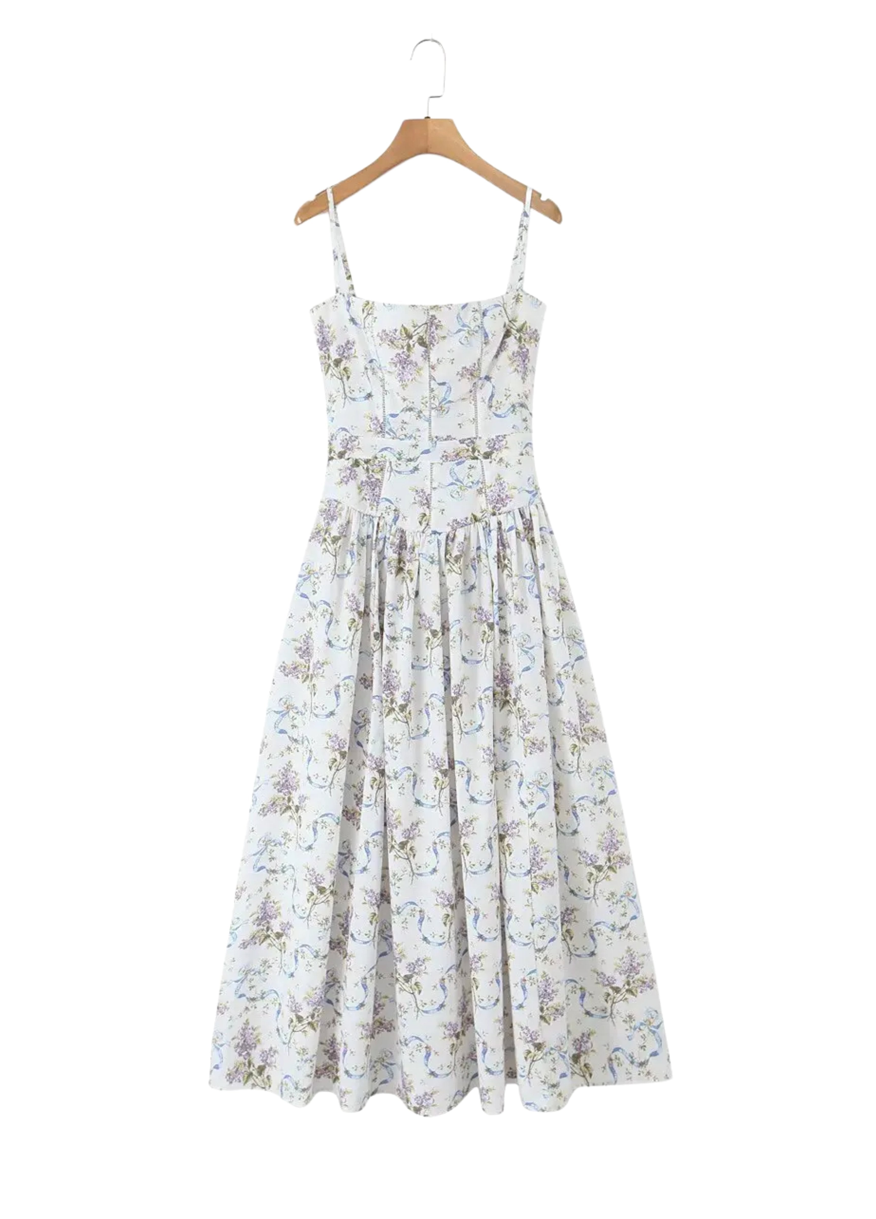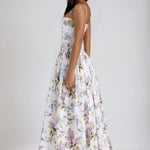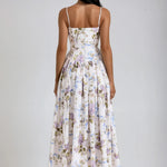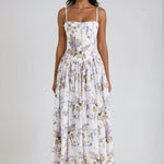 Seraphina is crafted in an off-white floral and ribbon print. The sculpted bodice, delicate ladder trims, and contoured panelling create a flattering, cinched-in shape with adjustable straps.