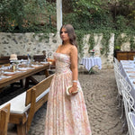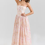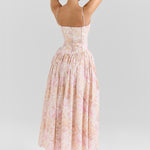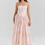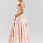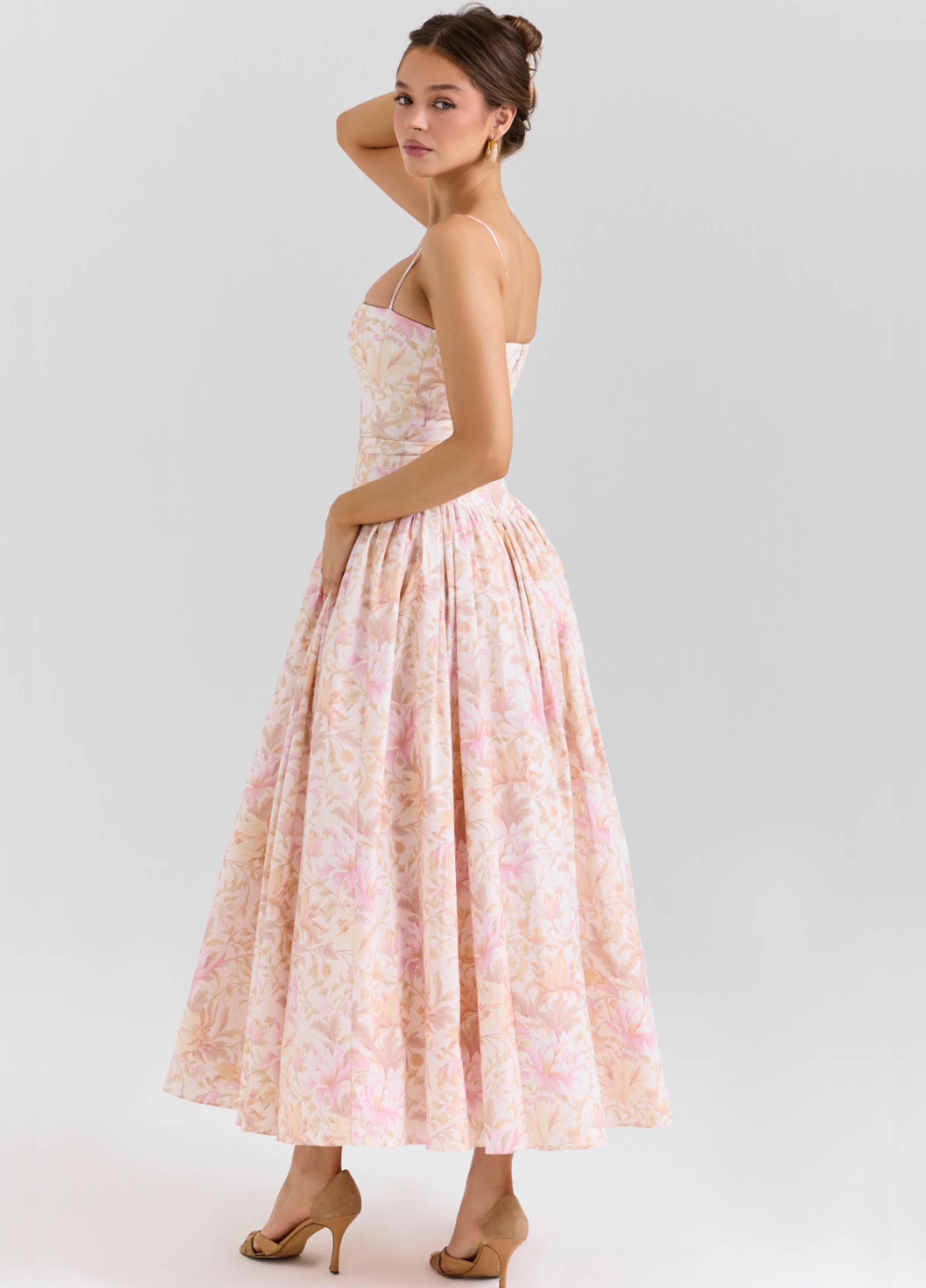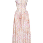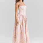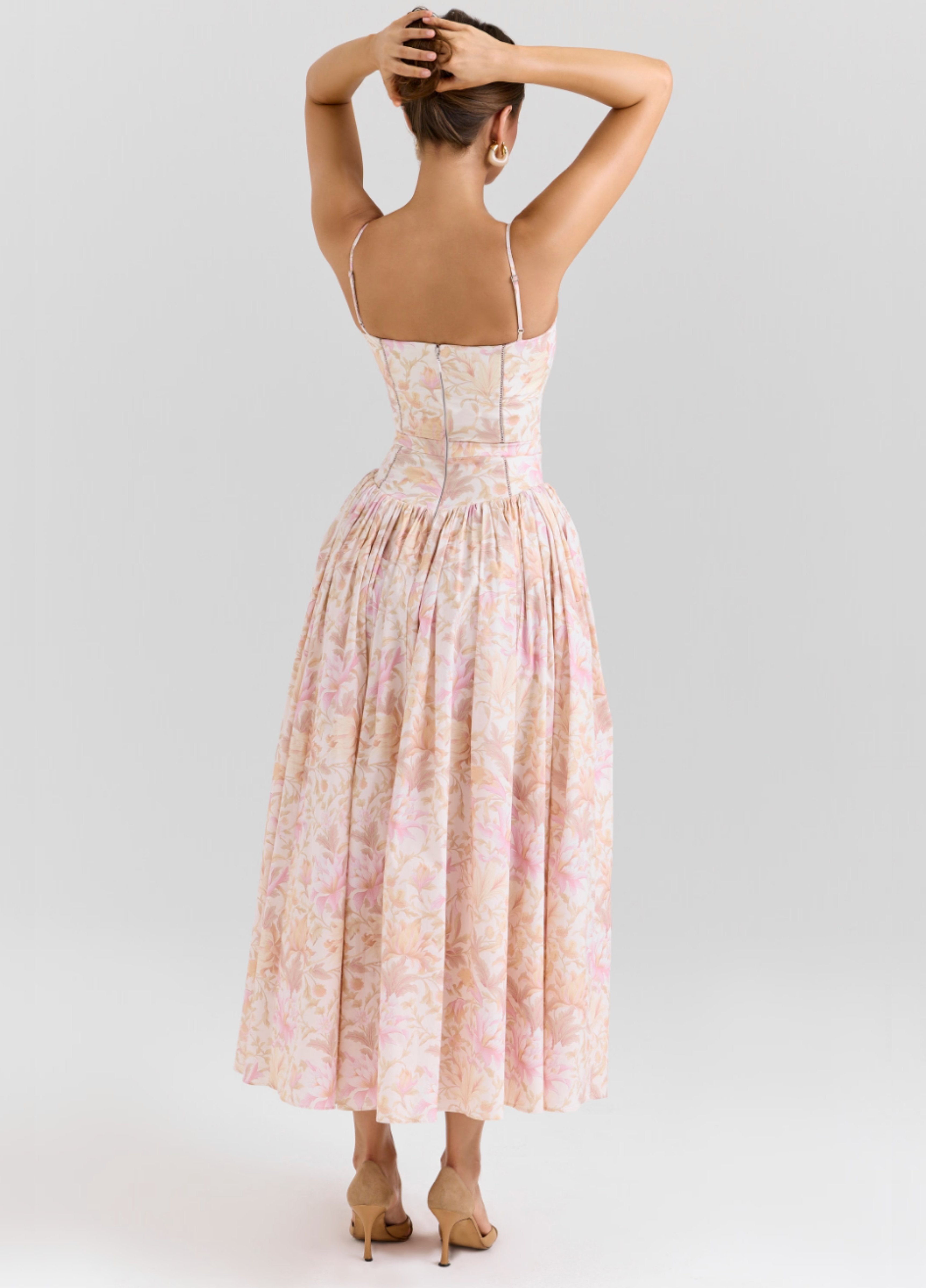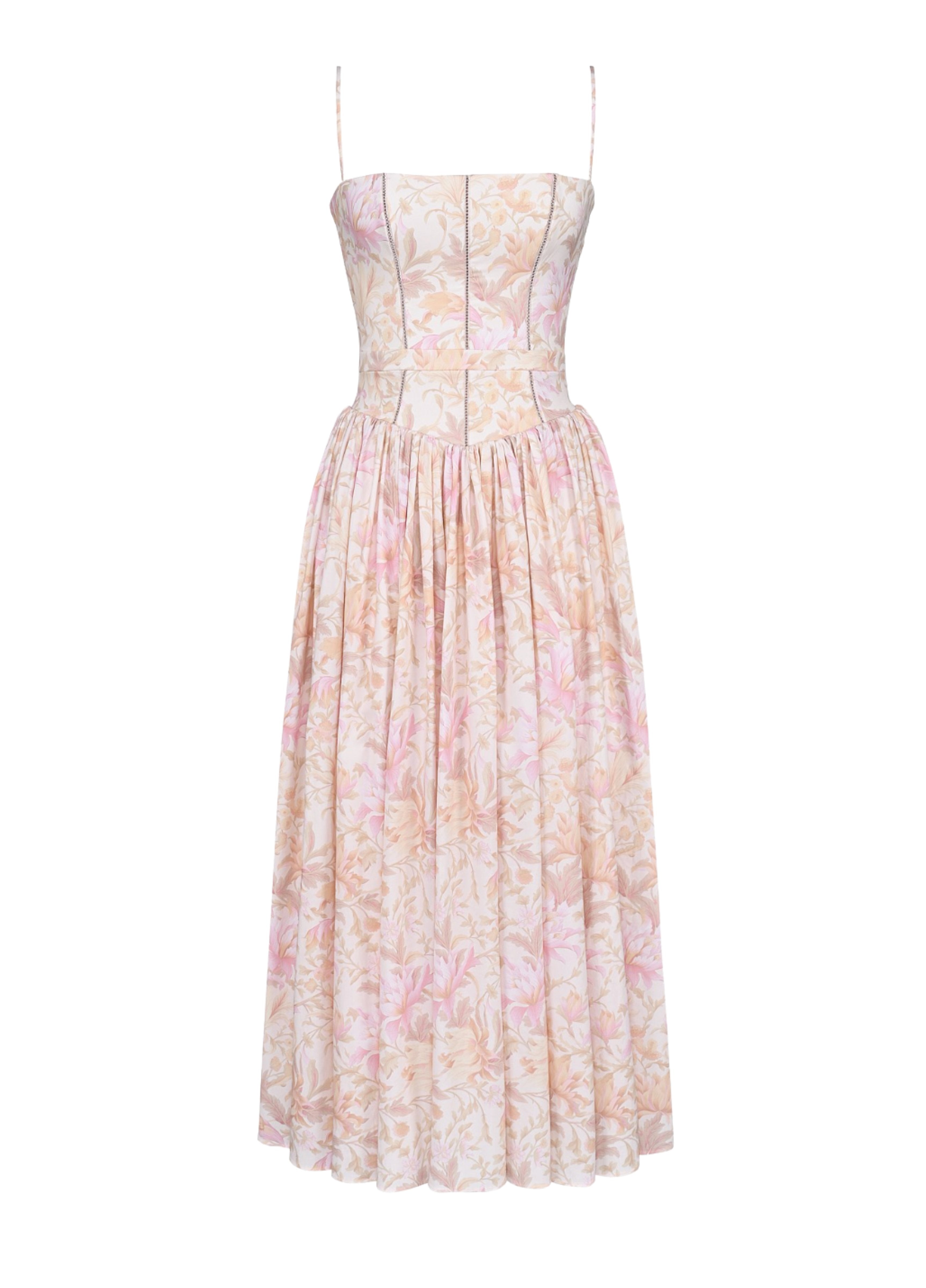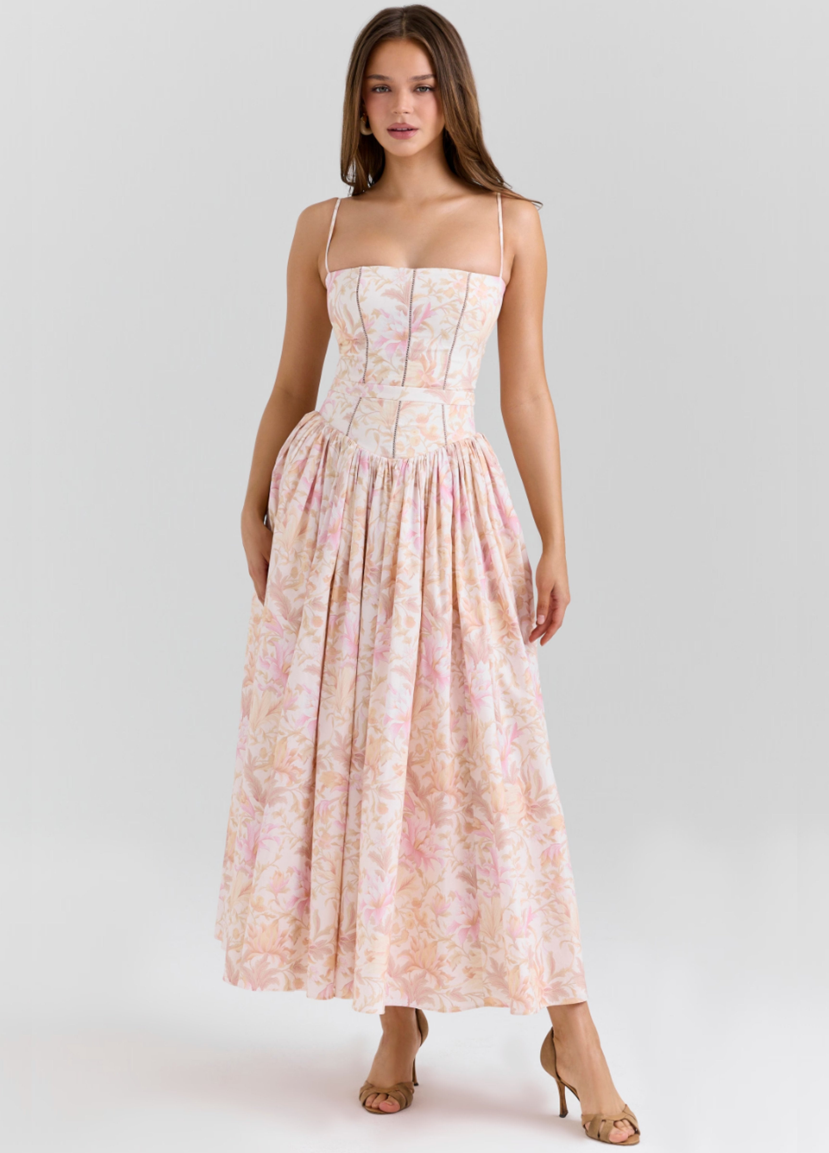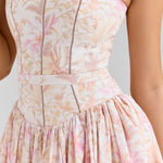 Seraphina is designed in a gentle peach floral print. The sculpted bodice, delicate ladder trims, and contoured panelling create a flattering, cinched-in shape with adjustable straps.