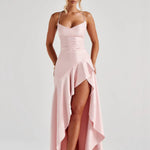 The high-low hem cascades with ruffles, revealing a thigh-high split that moves gracefully with every step. Fully lined for comfort, the silhouette blends femininity and confidence.