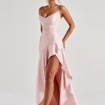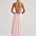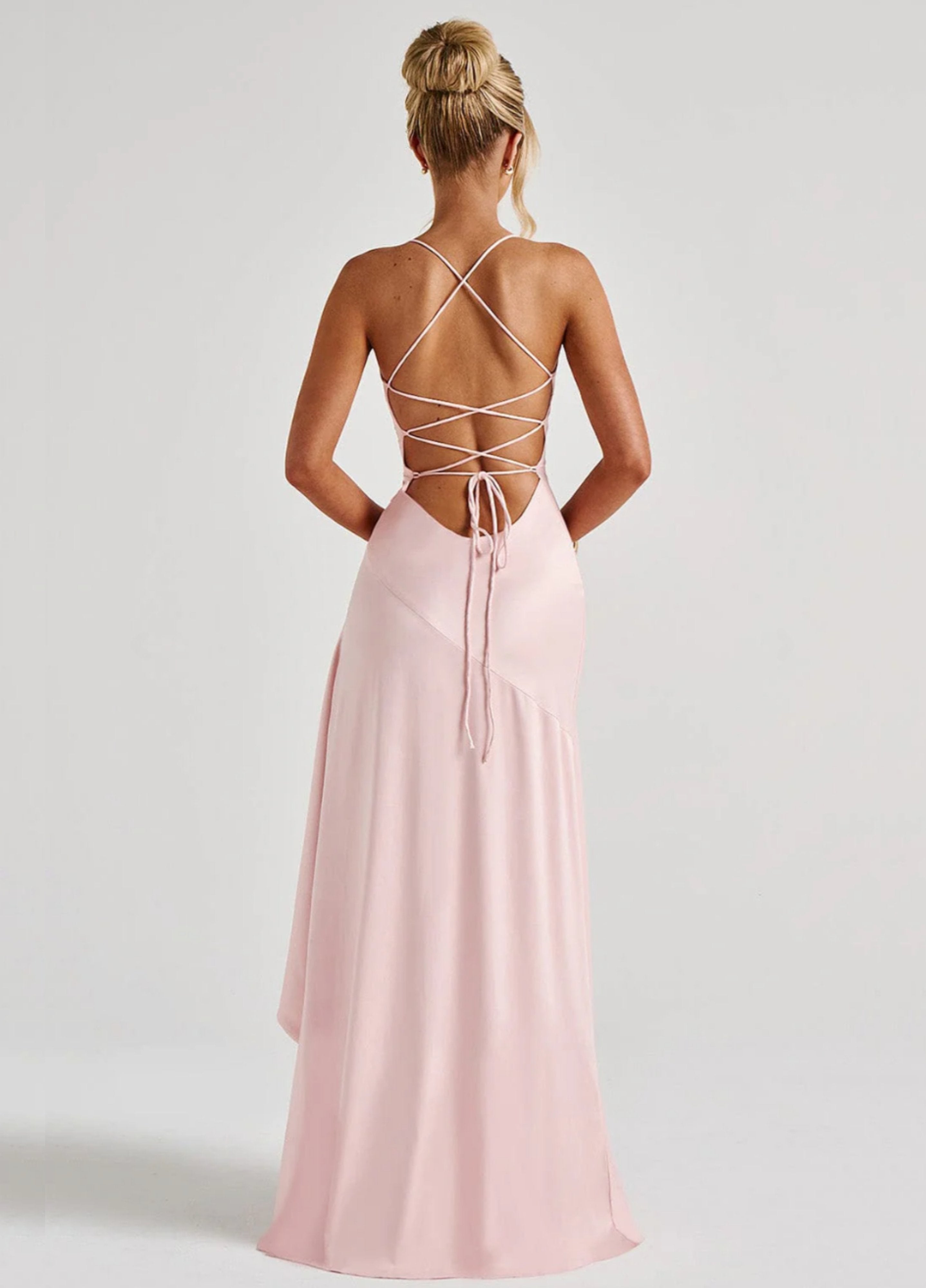 Amaris embodies refined elegance with its lustrous satin finish that glides effortlessly over the body. The twist cowl neckline brings a subtle allure, balanced by delicate straps and a lace-up back that allows for the perfect fit.