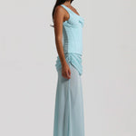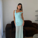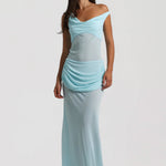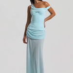 Elysia flows with effortless elegance. With a draped off-shoulder neckline and fluid georgette skirt, she flatters every curve — perfect for your best moments.