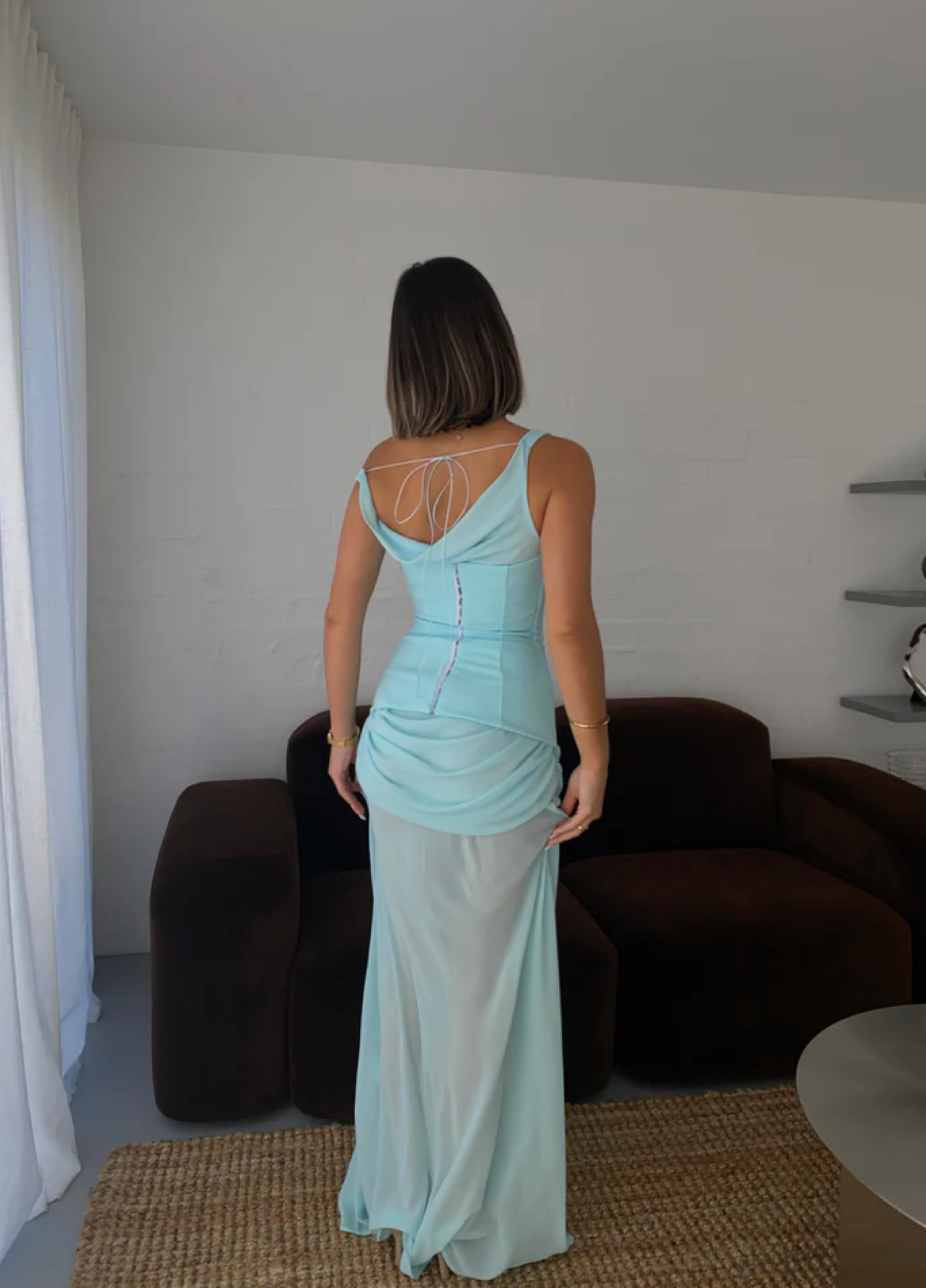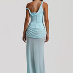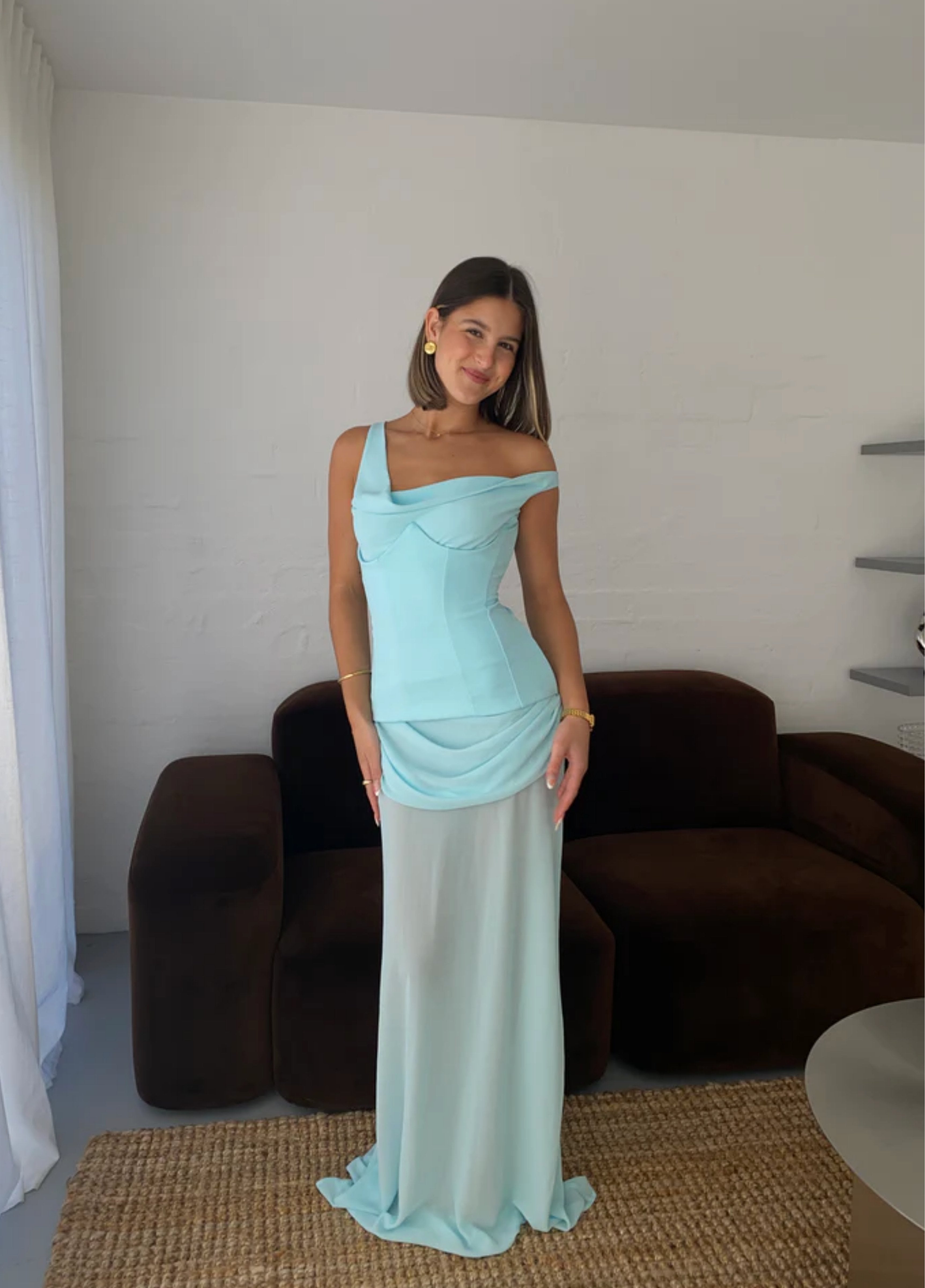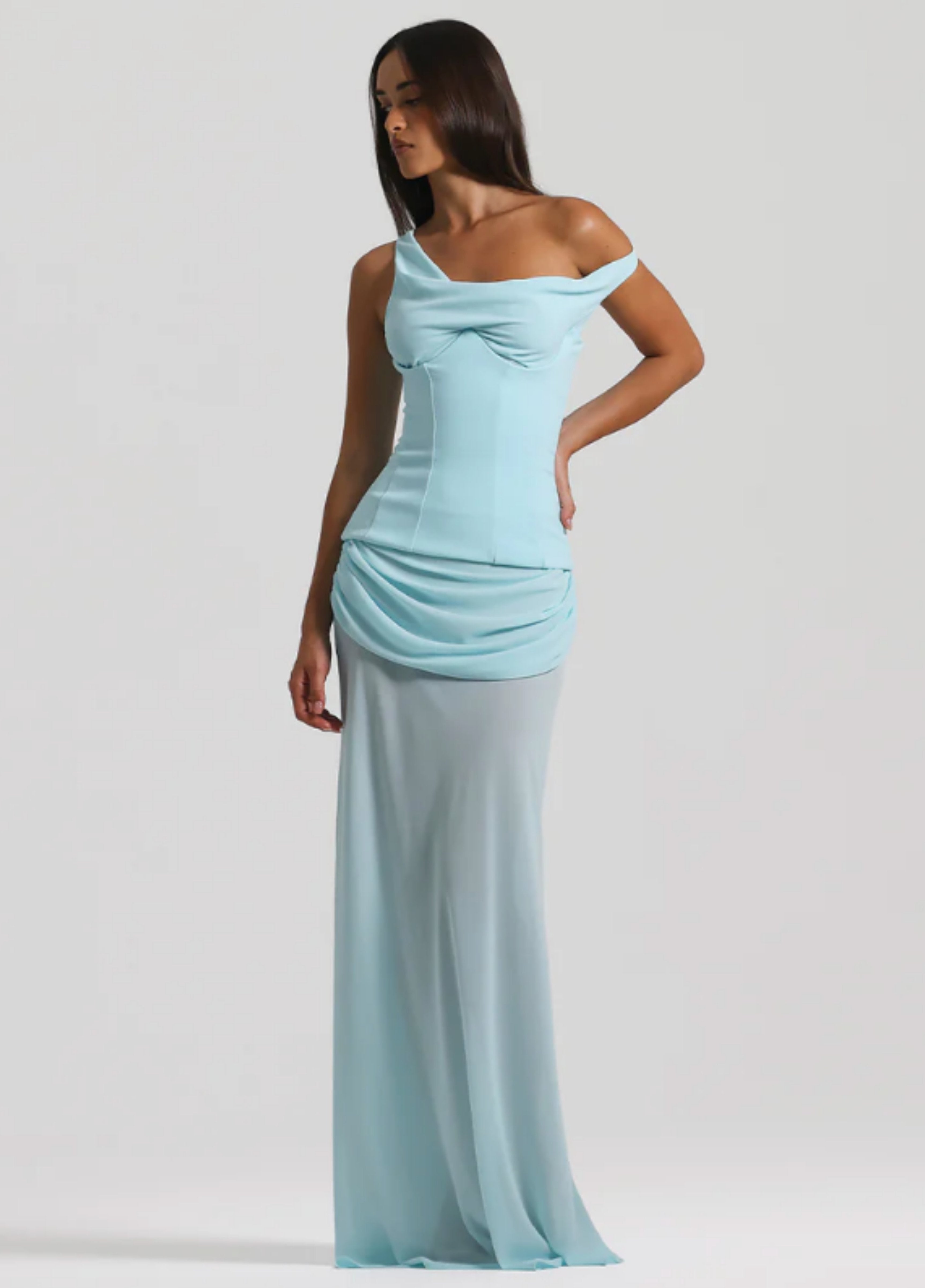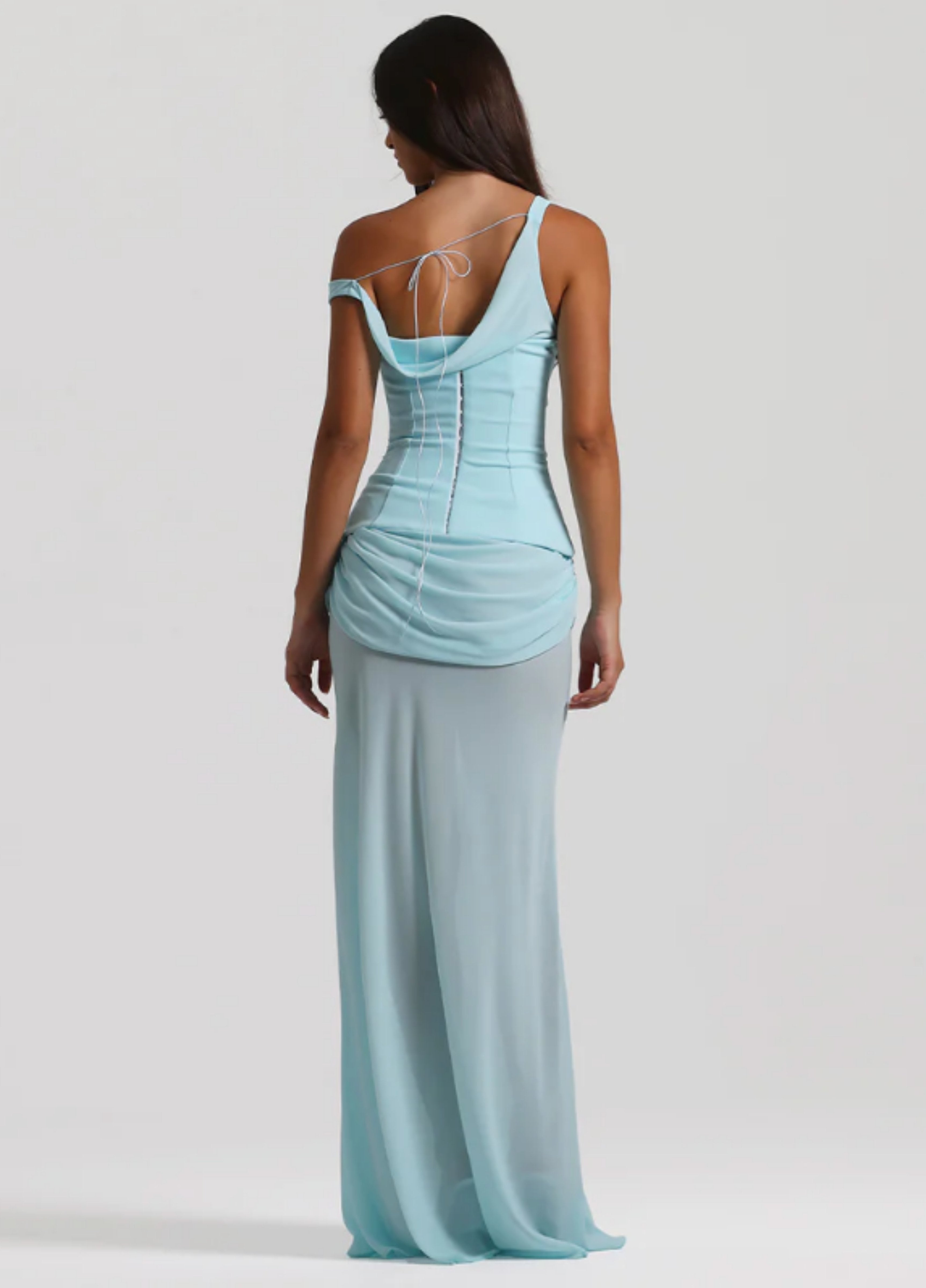 Elysia captivates with an asymmetrical off-shoulder neckline, softened by delicate georgette draping and a sculpted corset base that defines the waist. A corset with continuous underbust wiring and bodice seams offers structure and versatility. The draped skirt overlay flows into an exaggerated full-length hem.