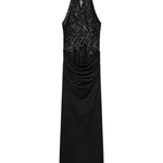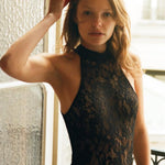Liora captivates with a halter silhouette and sleek tonal contrast, blending delicate lace with fluid stretch fabric. The sheer lace bodice frames the figure, balanced by soft side pleats that sculpt a flattering drape through the hips. Finished with an open back and button closure at the neck, this piece embodies understated sophistication.
