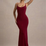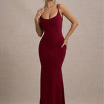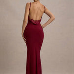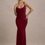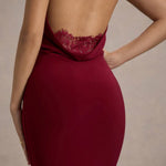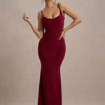 Saphira features a draped cowl neckline and open back framed by adjustable straps. Crafted from premium stretch jersey, it contours beautifully to the body. A touch of lace trim adds romantic detail, elevating its timeless appeal.