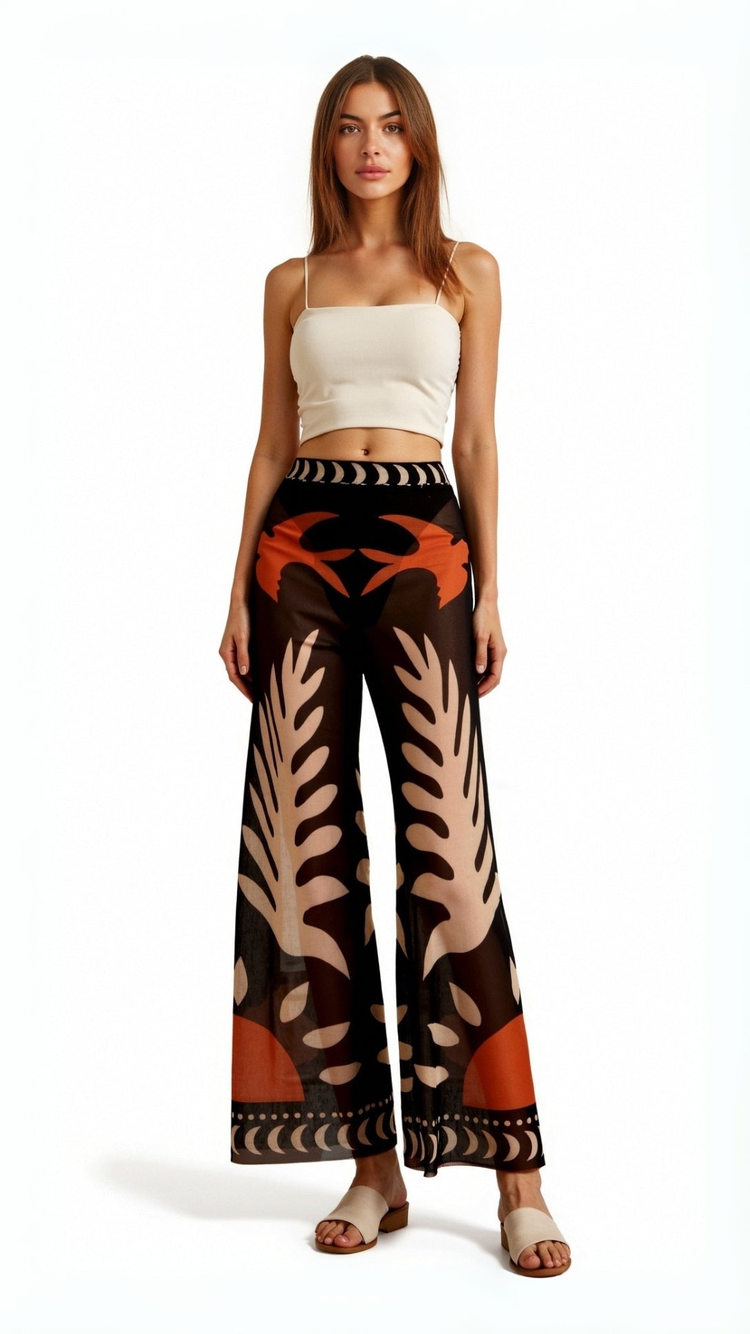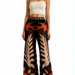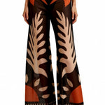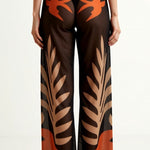 The 'Beth' Sheer Pants are bohemian artistry in motion with its wide-leg culottes featuring tropical leaf prints in terracotta, cream, and brown with elegant moon phase accents.