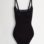 The 'Seamless Lace Thong Bodysuit' is delicate femininity perfected. This second-skin sensation features a graceful scoop neckline framed with intricate lace trim, while matching edging creates a barely-there leg line. The smooth silhouette and adjustable straps prove that comfort and allure can beautifully coexist.
