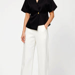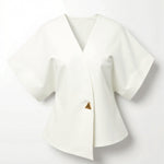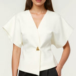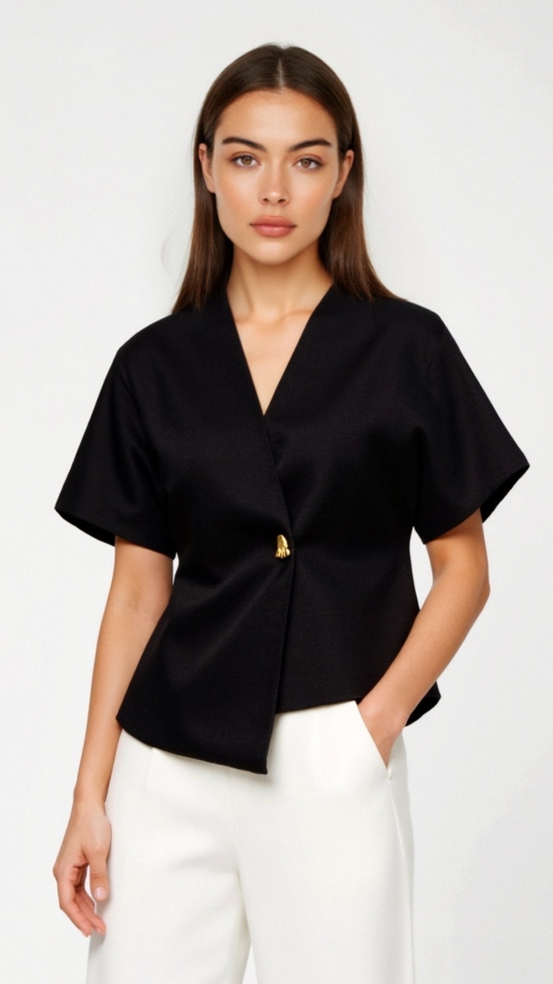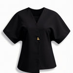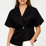 The 'Amy V-neck Blouse' brings major boss babe energy with its structured shoulder pads and chic asymmetrical wrap design that makes every outfit look intentionally put-together and effortlessly cool.