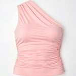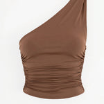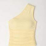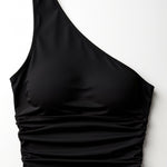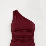 • One-shoulder silhouette with ruched details that do all the flattering for you