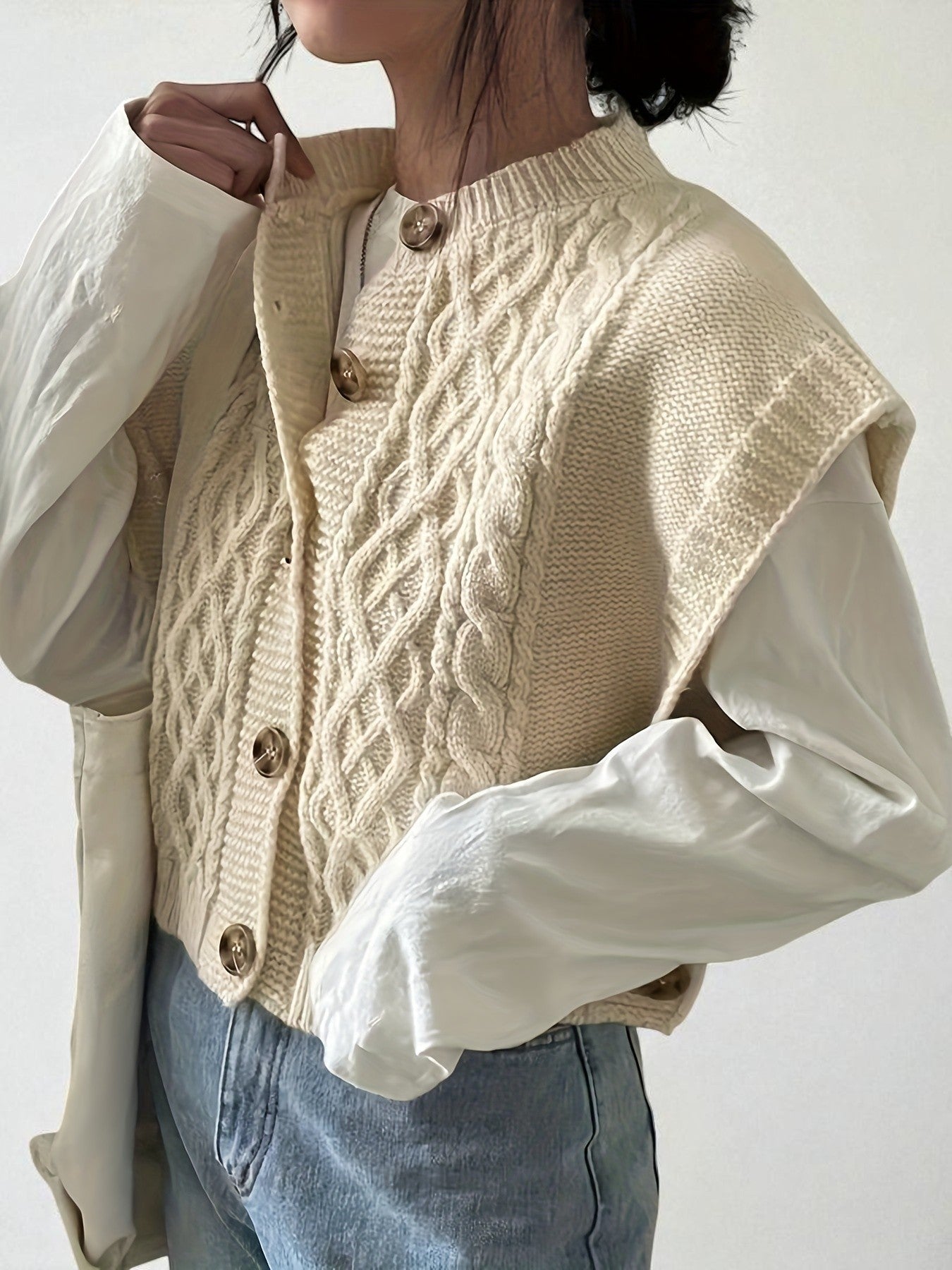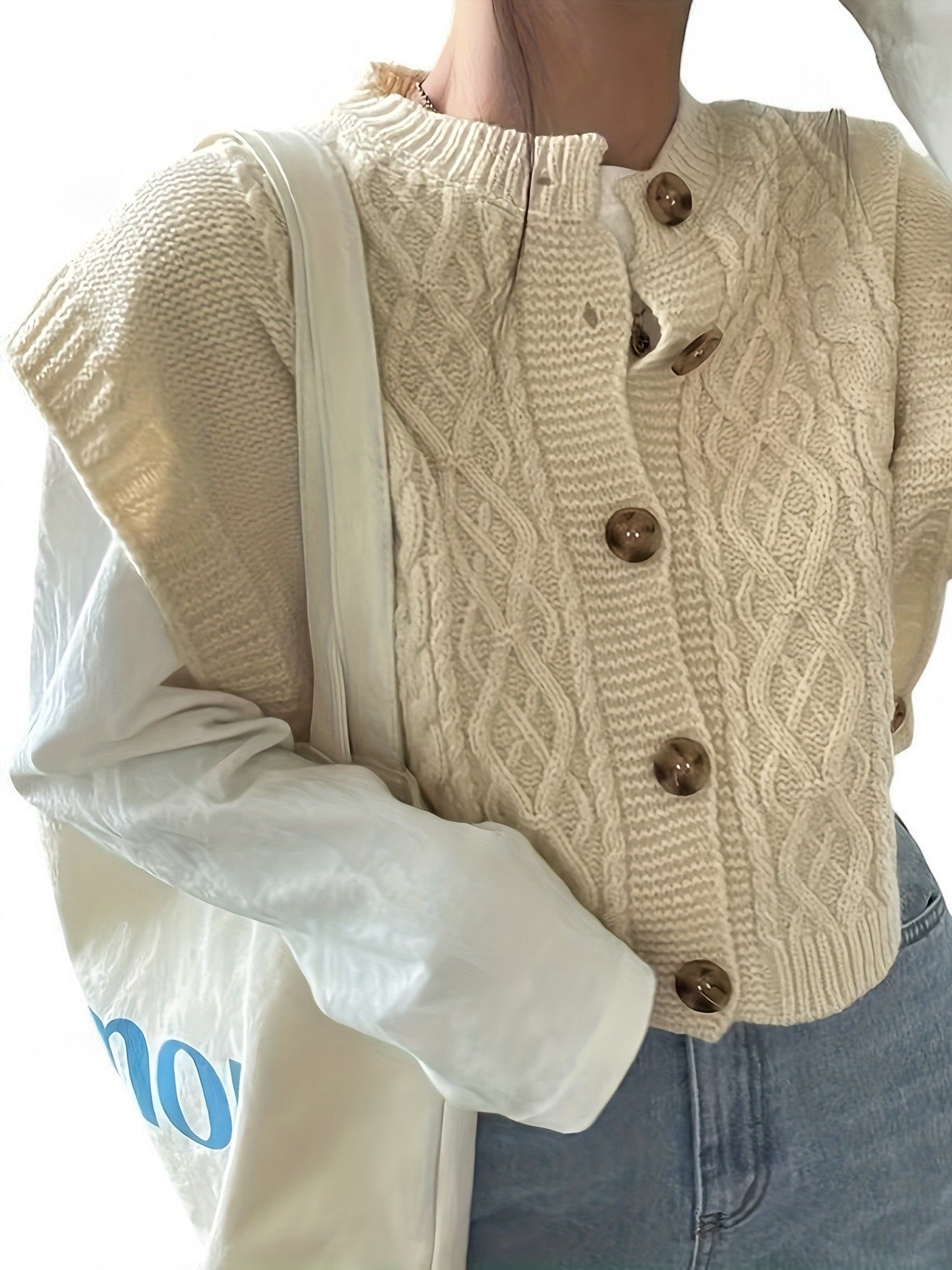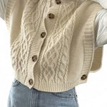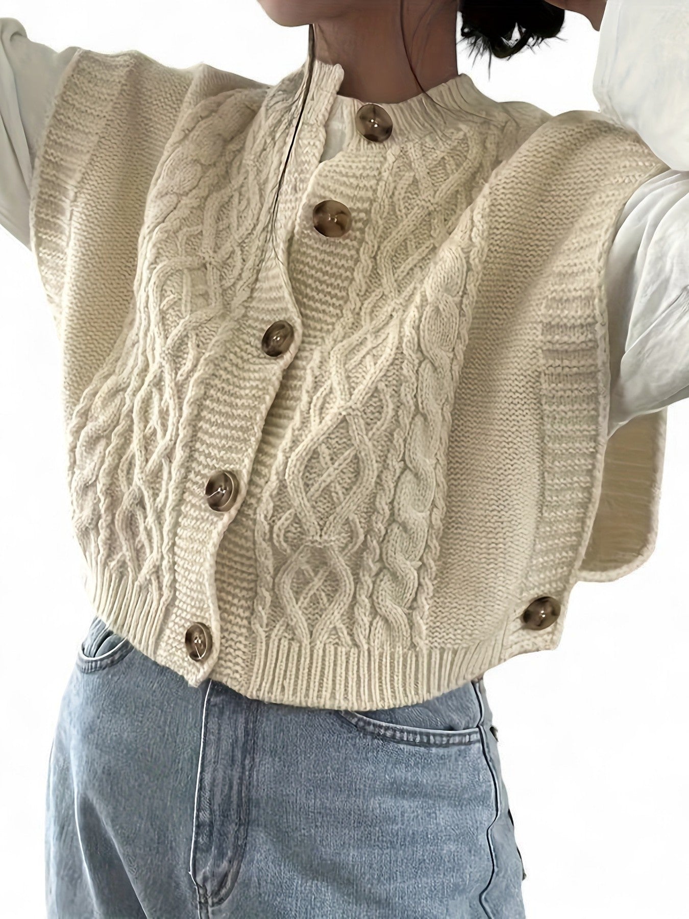 - Design: Textured twist-knit with a stylish button-front closure and classic crew neckline