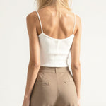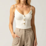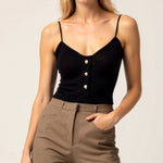 The 'Jasmine' top is refined simplicity perfected. This delicate piece features ribbed knit fabric with strategic seaming that creates beautiful lines, while gold-toned buttons add just the right touch of luxury. The sweetheart-inspired neckline and dainty straps frame your silhouette with effortless grace.