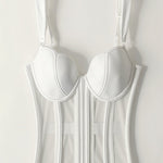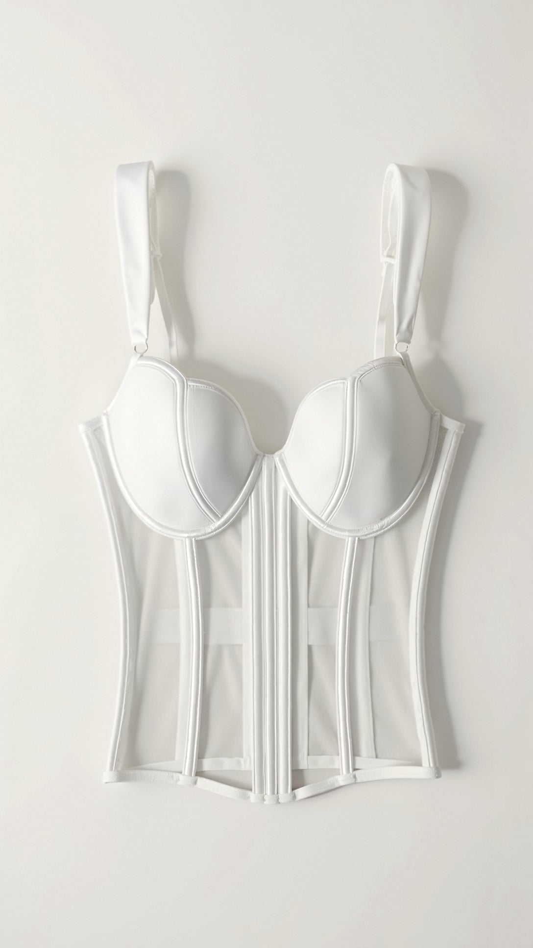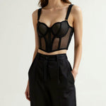 The 'Penelope' top is seductive structure perfected. This daring piece features a mesh paneled corset design with architectural boning that creates striking lines. The underwired cups and sleek straps offer support and style, while sheer panels add that perfect touch of allure.
