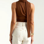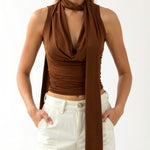 The 'Thalia' top is sophisticated drama personified. This versatile piece features a plunging cowl neckline that creates elegant draping, while the attached scarf adds endless styling possibilities. The ruched bodice hugs your curves perfectly, proving that sometimes less is luxe.