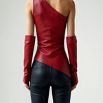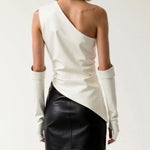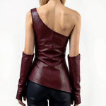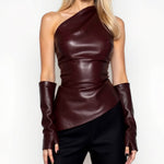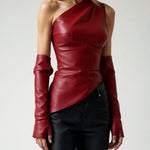 The 'Ulyssa' top is fierce elegance unleashed. This statement piece features luxe faux leather with architectural one-shoulder design that commands attention. The asymmetric hemline creates dramatic angles, while the matching opera gloves add that extra dose of power to your look.