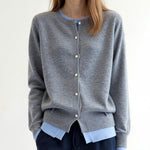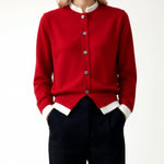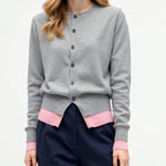 The 'Wynona' cardigan is preppy perfection reimagined. This versatile button-front sweater features premium knit with contrasting trim detail, while the cropped length creates a modern silhouette. Available in heather grey with blush, vibrant red with white, and rich mocha with cream accents.