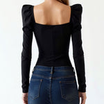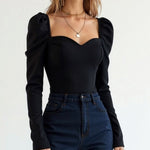 The 'Xenia' bodysuit is where romance meets edge. This statement piece features dramatic puff sleeves and a sculpted sweetheart neckline, while the sleek stretch fabric creates a flawless silhouette. The fitted bodice and long sleeves strike the perfect balance between feminine allure and modern sophistication.