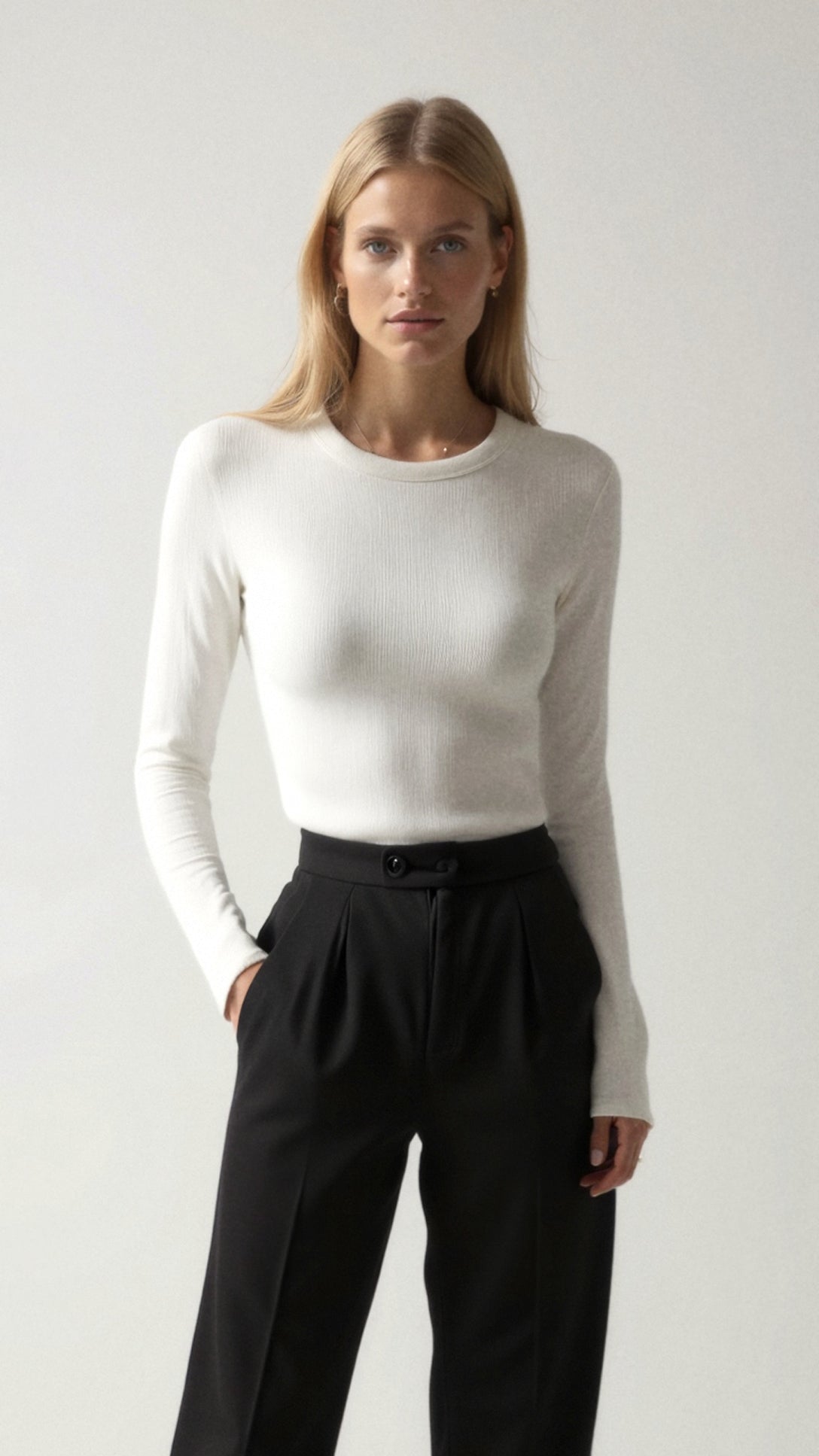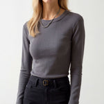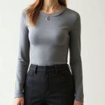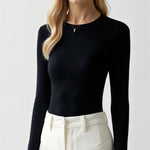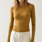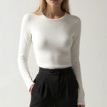 The 'Freya' top is effortless luxury in its purest form. This sophisticated essential features ultra-soft ribbed fabric that contours perfectly to your shape. The classic crew neckline and long sleeves create a timeless silhouette, while the seamless fit ensures comfort never compromises style.