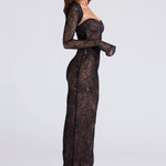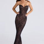 Vesper stuns in delicate stretch floral lace that contours every curve. The corset bodice features internal boning and underwired cups, while the silhouette flows into a full-length skirt with a subtle back slit.